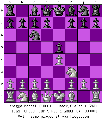 Last move : 0-1 2017 April 6 10:37:6 [Event "FICGS__CHESS__CUP_STAGE_1_GROUP_04__000001"] [Site "FICGS"] [Date "2017.03.01"] [Round "1"] [White "Knigge,Marcel"] [Black "Haack,Stefan"] [Result "0-1"] [WhiteElo "1800"] [BlackElo "1593"] 1.e4 e5 2.Nf3 Nc6 0-1 This chess game has been lost on time (started : 2017.03.01 0:58:37) King's pawn game Player Black won this chess game. Follow this game move after move (download)Alekhine is a poet who creates a work of art out of something that would hardly inspire another man to send home a picture post card. (Max Euwe) Rauchen ist dem Schachspieler bei seiner Arbeit, also im Wettkampf, untersagt. (Viktor Kortschnoi) Si no le temes a Spassky, entonces elimino el elemento del dinero. (Jim Slater) Le profane ne songe pas à la somme de jouissance dont il se prive, qui méconnaît ce jeu aux ressources aussi variées que passionnantes. (Jean-Marie Jeanton-Lamarche) Being number two sucks. (Andre Agassi)