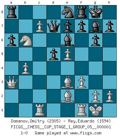 Last move : 1-0 2017 March 20 22:26:31 [Event "FICGS__CHESS__CUP_STAGE_1_GROUP_05__000001"] [Site "FICGS"] [Date "2017.03.01"] [Round "1"] [White "Domanov,Dmitry"] [Black "Rey,Eduardo"] [Result "1-0"] [WhiteElo "2305"] [BlackElo "1594"] 1.e4 c5 2.Nf3 Nc6 3.c3 d6 4.d4 cxd4 5.cxd4 Nf6 6.Nc3 g6 7.d5 Nb8 8.Nd4 Bg7 9.Be2 O-O 10.O-O Nbd7 11.Be3 Nc5 12.f3 a6 13.b4 Ncd7 14.Rc1 Ne5 15.Qb3 b5 16.a4 bxa4 17.Nxa4 Bd7 18.Nc6 Nxc6 19.dxc6 Be6 20.Qa3 d5 21.c7 Qd7 22.e5 Ne8 23.Nb6 1-0 Sicilian defense Kingside Castling by player Black (move 9) Kingside Castling by player White (move 10) Player White won this chess game. Follow this game move after move (download)Later, I began to succeed in decisive games. Perhaps because I realized a very simple truth: not only was I worried, but also my opponent. (Mikhail Tal) Es liegt in der Natur, vernüftig zu denken und unlogisch zu handeln. (Anatole France) Una mala movida nulifica cuarenta buenas. (Horowitz) Karpov est une pièce de musée. (Garry Kasparov) Luck has a peculiar habit of favoring those who don't depend on it. (Author unknown)