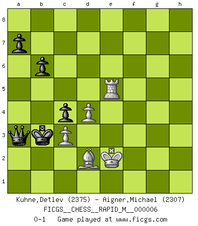 Last move : 0-1 2007 August 5 19:5:45 [Event "FICGS__CHESS__RAPID_M__000006"] [Site "FICGS"] [Date "2007.04.04"] [Round "1"] [White "Kuhne,Detlev"] [Black "Aigner,Michael"] [Result "0-1"] [WhiteElo "2375"] [BlackElo "2307"] 1.d4 Nf6 2.c4 e6 3.Nc3 Bb4 4.f3 d5 5.a3 Bxc3+ 6.bxc3 O-O 7.cxd5 exd5 8.e3 Nh5 9.Qc2 Re8 10.g4 Nf4 11.h4 c5 12.Kf2 Ng6 13.Bd3 Nc6 14.Ne2 c4 15.Bxg6 fxg6 16.h5 Qf6 17.hxg6 Bxg4 18.gxh7+ Kh8 19.Nf4 Bf5 20.Qe2 g5 21.Nxd5 Qf7 22.Nb4 g4 23.Nxc6 Be4 24.Rh4 Bxf3 25.Qe1 Bxc6 26.Kg1 Re7 27.Qg3 Rf8 28.Bd2 Be4 29.Rd1 Re6 30.Rxg4 Rf6 31.Rg8+ Kxh7 32.Rxf8 Qxf8 33.Qh4+ Rh6 34.Qxe4+ Rg6+ 35.Qxg6+ Kxg6 36.Ra1 Qe7 37.e4 Qxe4 38.Kf2 Kf6 39.Rf1 Qd3 40.Ke1 Ke6 41.Rf8 Qb1+ 42.Ke2 Qa2 43.Re8+ Kd7 44.Rb8 Kc7 45.Rh8 Qxa3 46.Rh7+ Kc6 47.Rh5 b6 48.Rh6+ Kb5 49.Rh5+ Ka4 50.Re5 Kb3 0-1 Nimzo-Indian : Kmoch variation Kingside Castling by player Black (move 6) 10 pieces endgame at move 45 : White KRBPP , Black KQPPP WHITE : King + 1 Rook 1 Bishop 2 Pawns BLACK : King + 1 Queen 3 Pawns Player Black won this chess game. Follow this game move after move (download)Even the laziest King flees wildly in the face of a double check ! (Aaron Nimzowitsch) Du musst nicht gut spielen, es reicht, wenn du besser spielst als dein Gegner. (Anonymous) Entre mas años cumplo, mas valoro los Peones. (Keres) Ce n'est pas pour s'amuser qu'il joue aux échecs : il célèbre un culte. (Vladimir Nabokov) Your best chance to get a Royal Flush in a casino is in the bathroom. (Anonymous)