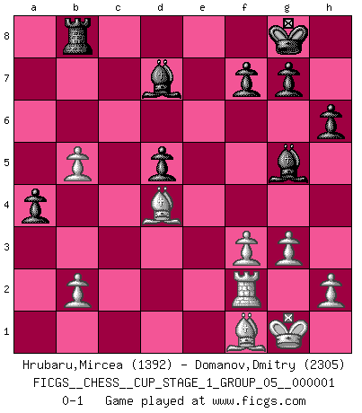Last move : 0-1 2017 May 28 19:1:33 [Event "FICGS__CHESS__CUP_STAGE_1_GROUP_05__000001"] [Site "FICGS"] [Date "2017.03.01"] [Round "1"] [White "Hrubaru,Mircea"] [Black "Domanov,Dmitry"] [Result "0-1"] [WhiteElo "1392"] [BlackElo "2305"] 1.e4 c5 2.Nf3 d6 3.d4 cxd4 4.Nxd4 Nf6 5.f3 Nc6 6.c4 e6 7.Nc3 Be7 8.Be3 O-O 9.Be2 d5 10.cxd5 exd5 11.Nxc6 bxc6 12.exd5 Nxd5 13.Nxd5 cxd5 14.O-O a5 15.Bd4 Qd6 16.Rf2 Rb8 17.Rc1 Rd8 18.Bf1 Bf5 19.a3 h6 20.g3 Bg5 21.Rc5 Rdc8 22.Rxc8+ Rxc8 23.Qe1 a4 24.Qb4 Qxb4 25.axb4 Rb8 26.b5 Bd7 0-1 This chess game has been lost on time (started : 2017.03.01 0:58:40) Sicilian : Prins (Moscow) variation Kingside Castling by player Black (move 8) Kingside Castling by player White (move 14) Player Black won this chess game. Follow this game move after move (download)Who is your opponent tonight, tonight I am playing against the Black pieces. (Akiba Rubinstein) Ich würde mich als ganz normalen Jungen bezeichnen [Im Alter von 12]. (Sergej Karjakin) El Peón aislado arroja penumbra sobre todo el tablero. (Aaron Nimzovich) Je menace de comprendre la position. (Anonyme) Ah, beer! The cause of, and the solution to, all of life's problems. (Homer Simpson)
