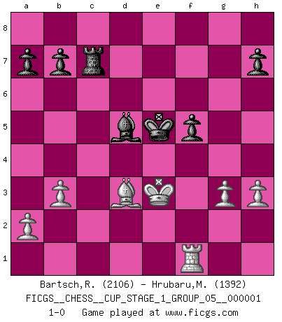 Last move : 1-0 2017 May 15 22:49:37 [Event "FICGS__CHESS__CUP_STAGE_1_GROUP_05__000001"] [Site "FICGS"] [Date "2017.03.01"] [Round "1"] [White "Bartsch,Reinhard Andrea"] [Black "Hrubaru,Mircea"] [Result "1-0"] [WhiteElo "2106"] [BlackElo "1392"] 1.c4 Nf6 2.d4 g6 3.Nc3 d5 4.e3 Bg7 5.cxd5 Nxd5 6.Qb3 Nb6 7.Nf3 O-O 8.Be2 Be6 9.Qc2 Bf5 10.Qb3 Be6 11.Qc2 Bf5 12.Qd1 c5 13.O-O cxd4 14.Nxd4 Bd7 15.e4 Nc6 16.Be3 Nxd4 17.Bxd4 Bc6 18.Bxg7 Qxd1 19.Raxd1 Kxg7 20.f3 Rad8 21.Kf2 f5 22.exf5 gxf5 23.f4 Kf6 24.g3 e6 25.Rxd8 Rxd8 26.Ke3 Rd7 27.h3 Nd5+ 28.Nxd5+ Bxd5 29.Bd3 Rg7 30.Kf2 e5 31.fxe5+ Kxe5 32.b3 Rc7 33.Ke3 1-0 English, 1...Nf6 (Anglo-Indian defense) Kingside Castling by player Black (move 7) Kingside Castling by player White (move 13) Player White won this chess game. Follow this game move after move (download)Best by test: 1. e4 (Bobby Fischer) Fischer machte Schach einfach zu einer aufregenden Sache, wann immer er sich ans Brett setzte. (Raymond Keene) Una buena memoria, concentración, imaginación y una fuerte voluntad, se requiere para llegar a ser un buen jugador. (Bobby Fischer) Il a essayé de se convaincre qu'il pourrait empêcher toutes les erreurs et ne jamais perdre. L'horreur ! Gary Kasparov au sujet de Robert Fischer. The man who strikes first admits that his ideas have given out. (Chinese proverb)
