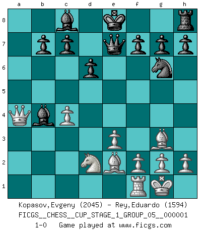Last move : 1-0 2017 March 17 17:39:47 [Event "FICGS__CHESS__CUP_STAGE_1_GROUP_05__000001"] [Site "FICGS"] [Date "2017.03.01"] [Round "1"] [White "Kopasov,Evgeny"] [Black "Rey,Eduardo"] [Result "1-0"] [WhiteElo "2045"] [BlackElo "1594"] 1.d4 Nf6 2.c4 e5 3.dxe5 Ng4 4.Bf4 Nc6 5.Nf3 Bb4+ 6.Nbd2 Qe7 7.e3 Ngxe5 8.Nxe5 Nxe5 9.Be2 d6 10.O-O Ng6 11.Bg3 a5 12.a3 Bc5 13.b4 axb4 14.axb4 Rxa1 15.Qxa1 Bxb4 16.Qa4+ 1-0 Budapest : Rubinstein variation Kingside Castling by player White (move 10) Player White won this chess game. Follow this game move after move (download)The enormous mental resilience, without which no Chess player can exist, was so much taken up by Chess that he could never free his mind of this game. (Albert Einstein) Nie in meinem Leben habe ich die französische Verteidigung gespielt, welche die Stumpfsinnigste von allen ist. (Wilhelm Steinitz) Cualquier cambio de material en una posición debe venir por medio de un mate, una captura o promoción de Peón. (Purdy) Les Echecs ont trois composantes : le temps, l'espace et le matériel en dernier. (Mikhail Tal) Perfection is achieved, not when there is nothing more to add, but when there is nothing left to take away. (Antoine de Saint-Exupéry)