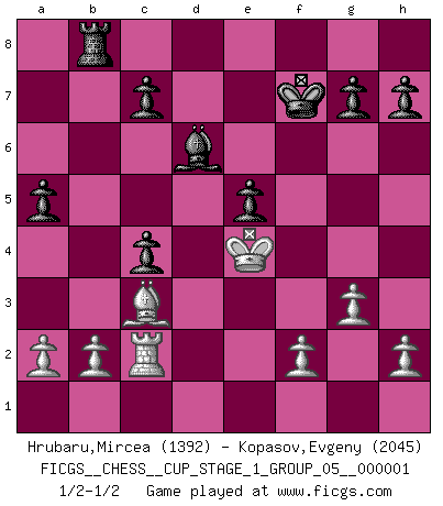 Last move : 1/2-1/2 2017 May 26 12:48:5 [Event "FICGS__CHESS__CUP_STAGE_1_GROUP_05__000001"] [Site "FICGS"] [Date "2017.03.01"] [Round "1"] [White "Hrubaru,Mircea"] [Black "Kopasov,Evgeny"] [Result "1/2-1/2"] [WhiteElo "1392"] [BlackElo "2045"] 1.d4 d5 2.c4 dxc4 3.Nf3 Nf6 4.g3 Nc6 5.Nc3 e5 6.Nxe5 Qxd4 7.Nxc6 Qxd1+ 8.Nxd1 bxc6 9.Bg2 Nd5 10.Ne3 Bb4+ 11.Kf1 O-O 12.Nxd5 cxd5 13.Bxd5 Rd8 14.e4 Rb8 15.Kg2 Be6 16.Bxe6 fxe6 17.Bg5 Rd4 18.Be3 Rxe4 19.Rhc1 Bd6 20.Rc2 a5 21.Kf3 Re5 22.Rd1 Rd5 23.Rd4 Rxd4 24.Bxd4 e5 25.Bc3 Kf7 26.Ke4 1/2-1/2 Queen's gambit accepted Kingside Castling by player Black (move 11) This chess game ended in a draw. Follow this game move after move (download)It's just you and your opponent at the board and you're trying to prove something. (Bobby Fischer) Alles was ich jemals tun will ist Schach spielen. (Robert James Fischer) El Ajedrez es un terrible juego. Si no controlas el centro, tu oponente tiene una posición mas holgada. Si tienes control del centro, ¡entonces realmente tu tienes algo de que preocuparte!. (Siegbert Tarrasch) L'ordinateur a tué l'originalité. Il n'y a plus guère d'aventures sur l'échiquier. (Jacob Murray) The quality of decision is like the well-timed swoop of a falcon which enables it to strike and destroy its victim. (Sun Tzu)
