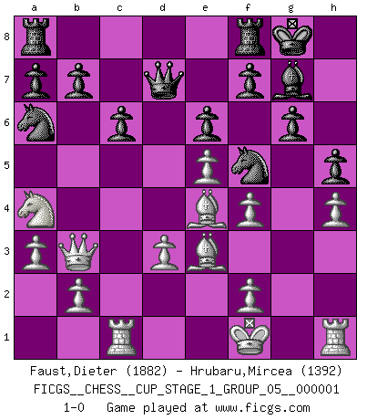 Last move : 1-0 2017 May 30 19:26:15 [Event "FICGS__CHESS__CUP_STAGE_1_GROUP_05__000001"] [Site "FICGS"] [Date "2017.03.01"] [Round "1"] [White "Faust,Dieter"] [Black "Hrubaru,Mircea"] [Result "1-0"] [WhiteElo "1882"] [BlackElo "1392"] 1.Nf3 Nf6 2.c4 g6 3.Nc3 d5 4.cxd5 Nxd5 5.Na4 Nc6 6.e4 Ndb4 7.d3 Bg4 8.a3 Bxf3 9.gxf3 Na6 10.f4 Nd4 11.Be3 c6 12.Bg2 Bg7 13.h4 h5 14.e5 Qd7 15.Rc1 Nf5 16.Be4 O-O 17.Qb3 e6 18.Kf1 1-0 This chess game has been lost on time (started : 2017.03.01 0:58:40) Reti Opening Kingside Castling by player Black (move 16) Player White won this chess game. Follow this game move after move (download)I feel as if I were a piece in a game of Chess, when my opponent says of it: That piece cannot be moved. (Soren Kierkegaard) Wenn du auf das Glück wartest, wird das Leben ziemlich langweilig. (Mikhail Nekhemyevich Tal) Para mi, el Ajedrez es la vida y cada partida es como una nueva vida. Todo jugador de Ajedrez suele vivir muchas vidas durante su vida. (Eduard Gufeld) En blitz, le Cavalier l'emporte sur le Fou. (Vlastimil Hort) If only people were all showed a certain minimum level of niceness; if only people didn't retract verbal draw offers (without draw box ticked) on ficgs; if only people didn't kill; if only people didn't run concentration / extermination camps, if only people didn't drop nuclear bombs on Hiroshima and Nagasaki, and so on - it would be a much more beautiful world. But sadly, things are not so... (Normajean Yates)