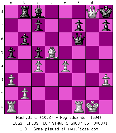 Last move : 1-0 2017 May 28 17:6:53 [Event "FICGS__CHESS__CUP_STAGE_1_GROUP_05__000001"] [Site "FICGS"] [Date "2017.03.01"] [Round "1"] [White "Mach,Jiri"] [Black "Rey,Eduardo"] [Result "1-0"] [WhiteElo "1072"] [BlackElo "1594"] 1.d4 Nf6 2.c4 e5 3.dxe5 Ng4 4.Bf4 Nc6 5.Nf3 Bb4+ 6.Nbd2 Qe7 7.e3 Ngxe5 8.Nxe5 Nxe5 9.Be2 d6 10.O-O O-O 11.Nb3 Ng6 12.Bg3 a5 13.a3 Bc5 14.Nxc5 dxc5 15.Qc2 b6 16.Bf3 Rb8 17.Bd5 Ne5 18.h3 Kh8 19.f4 Ng6 20.f5 Nh4 21.e4 Qg5 22.Qf2 Nxg2 23.Qxg2 Qe7 24.f6 gxf6 25.Bh4 Rg8 26.Bxf6+ Qxf6 27.Qxg8+ 1-0 Budapest : Rubinstein variation Kingside Castling by player White (move 10) Kingside Castling by player Black (move 10) Player White won this chess game. Follow this game move after move (download)A passed Pawn increases in strength as the number of pieces on the board diminishes. (Capablanca) Dass jemand wie Surab Asmaiparaschwili, der selbst Elopunkte gekauft hat , Vize-Präsident der Fide werden konnte, sagt schon einges über den Zustand dieser Organisation aus. (Joel Lautier) Vive, pierde y aprende al observar a tu oponente como gana. (Amber Steenbock) Roi des jeux et jeu des rois, les échecs portent en eux un sentiment d'infini. Ils donnent à celui qui s'est efforcé d'en approfondir les arcanes l'impression de n'être pas à la mesure de l'homme; en fait, ils constituent un résumé de l'univers, un microcosme, et figurent cette grande échelle qui, dans les plans de la lumière descend jusqu'à la matière, qui des abîmes insondables remonte jusqu'en l'infini de Dieu. (Pyrame) However beautiful the strategy, you should occasionally look at the results. (Winston Churchill)