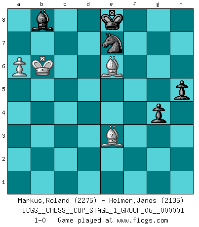 Last move : 1-0 2017 September 13 2:54:10 [Event "FICGS__CHESS__CUP_STAGE_1_GROUP_06__000001"] [Site "FICGS"] [Date "2017.03.01"] [Round "1"] [White "Markus,Roland"] [Black "Helmer,Janos"] [Result "1-0"] [WhiteElo "2275"] [BlackElo "2135"] 1.e4 c5 2.Nf3 d6 3.d4 cxd4 4.Nxd4 Nf6 5.Nc3 a6 6.h3 e5 7.Nde2 h5 8.g3 Be6 9.Bg2 Nbd7 10.a4 Be7 11.b3 Qc7 12.Bg5 Rc8 13.O-O Nf8 14.a5 Ng6 15.h4 O-O 16.Ra2 Ng4 17.Bc1 Nf6 18.Qd3 Bd8 19.Nd5 Nxd5 20.exd5 Bg4 21.f3 Bd7 22.Be3 Rb8 23.Ba7 Ra8 24.Bf2 Rb8 25.c4 b5 26.Rc1 bxc4 27.bxc4 f5 28.c5 Bb5 29.Qd1 Qf7 30.c6 Bc7 31.f4 Bxe2 32.Qxe2 exf4 33.Qe6 fxg3 34.Bxg3 Qxe6 35.dxe6 Rb3 36.Bf2 Ne7 37.R2a1 Rfb8 38.Bf1 Ra8 39.Bc4 R3b8 40.Rcb1 Rc8 41.Rb7 d5 42.Bb3 Nxc6 43.Bxd5 Ne7 44.Bg2 Rab8 45.Rab1 Kf8 46.Rxb8 Rxb8 47.Rxb8+ Bxb8 48.Bb7 Bd6 49.Bb6 Bb4 50.Kf2 g6 51.Ke2 f4 52.Kd3 f3 53.Bxf3 Kg7 54.Kc4 Be1 55.Kc5 Bg3 56.Be2 Kf6 57.Bxa6 Kxe6 58.Bb7 Kd7 59.Bg2 Ke8 60.Bh3 Bxh4 61.Be6 Bg3 62.a6 Bb8 63.Kb5 g5 64.Be3 g4 65.Kb6 1-0 Sicilian : Najdorf, Adams attack Kingside Castling by player White (move 13) Kingside Castling by player Black (move 15) 10 pieces endgame at move 57 : White KBBPP , Black KBNPP WHITE : King + 2 Bishops 2 Pawns BLACK : King + 1 Bishop 1 Knight 2 Pawns 9 pieces endgame at move 60 : White KBBP , Black KBNPP WHITE : King + 2 Bishops 1 Pawn BLACK : King + 1 Bishop 1 Knight 2 Pawns Player White won this chess game. Follow this game move after move (download)Bobby is the finest Chess player this country ever produced. His memory for the moves, his brilliance in dreaming up combinations, and his fierce determination to win are uncanny. (John Collins) Ein Schachspiel besteht aus drei Phasen: Die erste, wenn du hofftst den Vorteil zu haben, die zweite, wenn du glaubst einen Vorteil zu haben, und die dritte.... wenn du weißt Du wirst verlieren. (Savielly Grigorievitsch Tartakower) Tu puedes aprender mucho mas de una partida que pierdas que de una partida ganada. Tendras que perder cientos de partidas antes de llegar a ser un buen jugador. (Jose Raul Capablanca) La conception d'un plan est le processus par lequel un joueur exploite les avantages de sa position tout en s'efforçant d'en réduire au minimum les inconvénients. Afin de garantir le succès, un plan doit toujours se fonder sur un diagnostic objectif des particularités d'une position. La conception d'un plan est d'autant plus difficile que la position est équilibrée, et grandement facilitée lorsqu'il n'existe qu'un seul plan susceptible de répondre aux exigences de la position. (Harry Golombek) If only faces could talk... (Pat Summerall, Sportscaster during the Super Bowl)