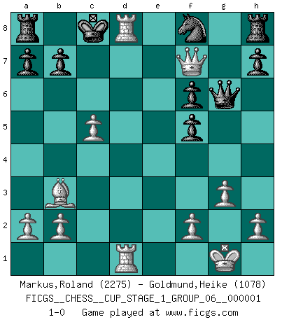 Last move : 1-0 2017 April 24 17:13:52 [Event "FICGS__CHESS__CUP_STAGE_1_GROUP_06__000001"] [Site "FICGS"] [Date "2017.03.01"] [Round "1"] [White "Markus,Roland"] [Black "Goldmund,Heike"] [Result "1-0"] [WhiteElo "2275"] [BlackElo "1078"] 1.e4 d5 2.exd5 Qxd5 3.Nc3 Qa5 4.d4 Nf6 5.Bd2 c6 6.Bc4 e6 7.Nd5 Qd8 8.Nxf6+ gxf6 9.Ne2 Qc7 10.O-O Bd6 11.Ng3 Nd7 12.Qh5 Nb6 13.Bb3 Ke7 14.c4 Nd7 15.Rad1 Nf8 16.c5 Bf4 17.Nf5+ exf5 18.Bxf4 Qxf4 19.g3 Qg5 20.Qxf7+ Kd8 21.d5 cxd5 22.Rxd5+ Bd7 23.Rfd1 Qg6 24.Rxd7+ Kc8 25.Rd8+ 1-0 Scandinavian (centre counter) defense Kingside Castling by player White (move 10) Player White won this chess game. Follow this game move after move (download)Modern Chess is too much concerned with things like Pawn structure. Forget it, Checkmate ends the game. (Nigel Short) Ein Kibitz ist einer, der deinem Gegner gute Ratschläge gibt. (Andrew Soltis) Los Peones son nacidos libres, y aún así, se encuentran encadenados por todos lados. (Rick Kennedy) Donnez-moi un Cavalier en 6e et je gagnerais toutes mes parties. (Steinitz) There are more things in heaven and earth than practically anywhere else. (Unknown)