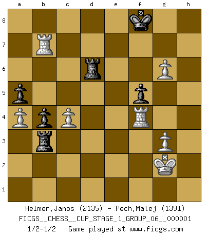 Last move : 1/2-1/2 2017 September 2 13:12:43 [Event "FICGS__CHESS__CUP_STAGE_1_GROUP_06__000001"] [Site "FICGS"] [Date "2017.03.01"] [Round "1"] [White "Helmer,Janos"] [Black "Pech,Matej"] [Result "1/2-1/2"] [WhiteElo "2135"] [BlackElo "1391"] 1.Nf3 Nf6 2.c4 b6 3.Nc3 Bb7 4.d3 c5 5.e4 d6 6.g3 g6 7.Bg2 Bg7 8.O-O O-O 9.h3 Nc6 10.Be3 Rc8 11.Qd2 Nd7 12.Rad1 a6 13.b3 Nd4 14.Bh6 e5 15.Bxg7 Kxg7 16.Ne2 Nxf3+ 17.Bxf3 b5 18.Bg2 b4 19.f4 a5 20.a4 exf4 21.Nxf4 Qe7 22.h4 Rce8 23.Bh3 Ne5 24.Rf2 Rd8 25.d4 cxd4 26.Qxd4 Rfe8 27.Re2 Qc7 28.Qf2 Qc5 29.Kf1 h5 30.Nd5 Qxf2+ 31.Kxf2 Bc8 32.Bxc8 Rxc8 33.Nf4 Ng4+ 34.Kg2 Red8 35.Rd5 Rc5 36.Rd4 Kf8 37.Nd3 Rc6 38.Rd5 Ra8 39.Rb5 Rca6 40.Nf2 Nf6 41.e5 dxe5 42.R2xe5 Ng4 43.Nxg4 hxg4 44.Rg5 Rd8 45.Rxg4 Rd3 46.Rf4 Rxb3 47.Rb7 f5 48.h5 Rd6 49.hxg6 1/2-1/2 Reti Opening Kingside Castling by player White (move 8) Kingside Castling by player Black (move 8) This chess game ended in a draw. Follow this game move after move (download)All my games are real. (Bobby Fischer) Ich liebe den Moment, wenn ich das Ego meines Gegenüber breche. (Robert James Fischer) El Ajedrez es una guerra en un tablero. El objetivo es aplastar la mente del oponente. (Bobby Fischer) On entre au jeu d'Echecs comme on entre en Religion. Pour le joueur d'Echecs, la partie d'Echecs c'est l'office, la messe, le défilé du 1er Mai, le dépôt de gerbe au Monument aux Morts. C'est un drame sacré. (Michel Roos) To err is human, to shift the blame on someone else is tactical. (Mladen Jankovic)