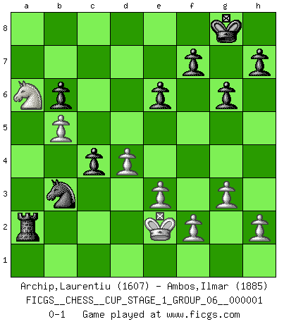 Last move : 0-1 2017 May 8 7:50:30 [Event "FICGS__CHESS__CUP_STAGE_1_GROUP_06__000001"] [Site "FICGS"] [Date "2017.03.01"] [Round "1"] [White "Archip,Laurentiu"] [Black "Ambos,Ilmar"] [Result "0-1"] [WhiteElo "1607"] [BlackElo "1885"] 1.d4 d5 2.Nf3 Nf6 3.g3 g6 4.Bg2 Bg7 5.O-O O-O 6.Nbd2 c6 7.c4 Bf5 8.cxd5 cxd5 9.Re1 Nc6 10.a3 Qb6 11.e3 Rfc8 12.Qb3 Qxb3 13.Nxb3 Bc2 14.Nbd2 e6 15.b4 a5 16.b5 Nb8 17.a4 Nbd7 18.Bb2 Nb6 19.Rec1 Nxa4 20.Ne1 Nxb2 21.Rxc2 Rxc2 22.Nxc2 Rc8 23.Ne1 b6 24.Bf1 Bf8 25.Ndf3 a4 26.Ne5 a3 27.Nc6 Ne4 28.Nc2 Ra8 29.N6b4 Bxb4 30.Nxb4 Ra4 31.Na6 a2 32.Be2 Nc4 33.Bxc4 dxc4 34.Kf1 Nd2+ 35.Ke2 Nb3 36.Rxa2 Rxa2+ 0-1 Queen's pawn game Kingside Castling by player White (move 5) Kingside Castling by player Black (move 5) Player Black won this chess game. Follow this game move after move (download)The older I grow, the more I value Pawns. (Keres) Ich spiele 70 Eröffnungssysteme. (Viktor Kortschnoi) Robert Fischer es la ley hacia si mismo. (Larry Evans) Tout change constamment, y compris dans le monde des Echecs. (Botvinnik) Strategy without tactics is the slowest route to victory. Tactics without strategy is the noise before defeat. (Sun Tzu)