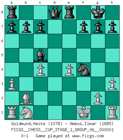 Last move : 0-1 2017 March 29 18:42:26 [Event "FICGS__CHESS__CUP_STAGE_1_GROUP_06__000001"] [Site "FICGS"] [Date "2017.03.01"] [Round "1"] [White "Goldmund,Heike"] [Black "Ambos,Ilmar"] [Result "0-1"] [WhiteElo "1078"] [BlackElo "1885"] 1.b4 e5 2.Bb2 Bxb4 3.Bxe5 Nf6 4.a3 Be7 5.c4 O-O 6.Nf3 d5 7.e3 Nc6 8.Bb2 Bf5 9.Nh4 Bg4 10.Nf3 d4 11.h3 Bxf3 12.Qxf3 Bc5 13.Bd3 dxe3 14.Be2 exf2+ 15.Kf1 Nd4 16.Qxf2 Ne4 17.Qf4 Re8 18.d3 Nxe2 19.dxe4 Nxf4 0-1 Polish (Sokolsky) opening Kingside Castling by player Black (move 5) Player Black won this chess game. Follow this game move after move (download)There must have been a time when men were demigods, or they could not have invented Chess. (Gustav Schenk) Kann Schach nicht schließlich das Nationalspiel der Deutschen werden? Und welche weiteren Ausblicke bieten sich dann dar! Welche Hebung des allgemeinen Kultur-Niveaus, ja der Moral, wenn das Schachbrett den Kartentisch verdrängen würde! Wahrlich, ein Ziel, des Schweißes der Edlen wert! (Siegbert Tarrasch) Los Peones son nacidos libres, y aún así, se encuentran encadenados por todos lados. (Rick Kennedy) Que feriez-vous si vous étiez en train de jouer aux échecs et que la fin du monde arrive ? Je continuerais à jouer. (Saint Borromée) If passion drives you, let reason holds the reins. (Benjamin Franklin)