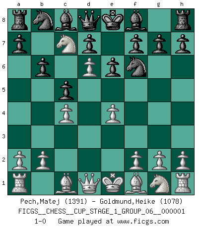 Last move : 1-0 2017 April 20 22:56:41 [Event "FICGS__CHESS__CUP_STAGE_1_GROUP_06__000001"] [Site "FICGS"] [Date "2017.03.01"] [Round "1"] [White "Pech,Matej"] [Black "Goldmund,Heike"] [Result "1-0"] [WhiteElo "1391"] [BlackElo "1078"] 1.d4 Nf6 2.c4 e6 3.Nc3 c5 4.d5 b6 5.e4 Bd6 6.Nb5 Be7 7.d6 Bf8 8.Nc7+ 1-0 Queen's pawn game Player White won this chess game. Follow this game move after move (download)Only the player with the initiative has the right to attack. (Wilhelm Steinitz) Es gibt keine einzige Frau, der ich nicht einen Springer vorgeben könnte und trotzdem gewänne. (Robert James Fischer) Cuando le juegas a Fischer, no es una cuestion de si vas a ganar o perder. Es una cuestion de si vas a sobrevivir. (Boris Spassky) Même un GMI sait rarement calculer sur plus de cinq coups une attaque à sacrifices. (Rudolf Spielmann) Luck has a peculiar habit of favoring those who don't depend on it. (Author unknown)