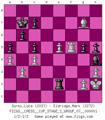 Last move : 1/2-1/2 2017 May 29 11:19:4 [Event "FICGS__CHESS__CUP_STAGE_1_GROUP_07__000001"] [Site "FICGS"] [Date "2017.03.01"] [Round "1"] [White "Sorbi,Luca"] [Black "Eldridge,Mark"] [Result "1/2-1/2"] [WhiteElo "2037"] [BlackElo "2272"] 1.e4 e5 2.Nf3 Nc6 3.Bb5 Nf6 4.O-O Nxe4 5.d4 Nd6 6.Bxc6 dxc6 7.dxe5 Nf5 8.Qxd8+ Kxd8 9.Nc3 Bd7 10.h3 h6 11.b3 Kc8 12.Bb2 b6 13.Rad1 c5 14.Nd5 a5 15.a4 Ne7 16.c4 Bf5 17.Rd2 Kb7 18.Nh4 Be6 19.f4 g5 20.Nf3 gxf4 21.Nxf4 Ng6 22.Nxg6 fxg6 23.Nh4 Rg8 24.Rf6 Be7 25.Rxe6 Bxh4 26.Rd7 Raf8 27.Bc1 h5 28.Bh6 Rf5 29.Kh2 Rf2 30.Rg7 Rxg7 31.Bxg7 g5 32.Rf6 Re2 33.Rf5 1/2-1/2 Ruy Lopez : Berlin defense, Open variation Kingside Castling by player White (move 4) This chess game ended in a draw. Follow this game move after move (download)A sacrifice is best refuted by accepting it. (Wilhelm Steinitz) Ich kenne keine einzige Person, die behaupten würde, Garri Kasparow sei ein guter Mensch (Nigel Short) Cuando tengo las piezas blancas, yo gano porque soy blanco; Cuando tengo las piezas negras, yo gano porque soy Bogolyubov. (Bogolyubov) Même si l'adversaire joue le coup analysé précédemment, recommencez l'analyse en voyant la nouvelle position. Première règle de Blumenfeld All maxims have their antagonist maxims; proverbs should be sold in pairs, a single one being but a half truth. (William Mathews)