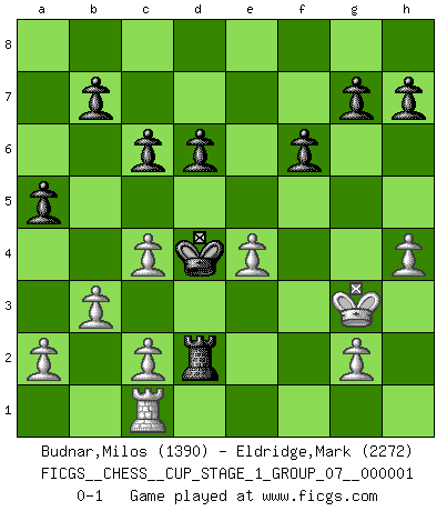 Last move : 0-1 2017 May 17 15:50:44 [Event "FICGS__CHESS__CUP_STAGE_1_GROUP_07__000001"] [Site "FICGS"] [Date "2017.03.01"] [Round "1"] [White "Budnar,Milos"] [Black "Eldridge,Mark"] [Result "0-1"] [WhiteElo "1390"] [BlackElo "2272"] 1.e4 e5 2.Nf3 Nc6 3.Bb5 Nf6 4.O-O Nxe4 5.Bxc6 dxc6 6.Re1 Nd6 7.Nxe5 Be7 8.Nc3 O-O 9.d3 Re8 10.Bf4 f6 11.Nc4 Nxc4 12.dxc4 Bf5 13.Ne4 Bf8 14.Qxd8 Raxd8 15.f3 Bxe4 16.Rxe4 Rxe4 17.fxe4 Bc5+ 18.Kh1 Rd4 19.b3 Bd6 20.Bxd6 cxd6 21.h3 Kf7 22.Re1 Rd2 23.Rc1 Ke6 24.h4 a5 25.Kh2 Ke5 26.Kg3 Kd4 0-1 Ruy Lopez : Berlin defense, Open variation Kingside Castling by player White (move 4) Kingside Castling by player Black (move 8) Player Black won this chess game. Follow this game move after move (download)It is difficult to play against Einstein's theory --on his first loss to Fischer. (Mikhail Tal) Frage: Wie viele Autos haben Sie schon zerstört? - Antwort: Nur zwei. (Loek van Wely) Repentinamente, me resultaba obvio en mi analisis que yo había pasado por alto lo que Fischer había visto en el tablero con la mas grande facilidad. (Mikhail Botvinnik) Je ne suis pas le dernier à jouer lâchement des coups douteux pendant le zeïtnot de l'adversaire pour l'achever: en effet les coups qui font le plus peur sont ceux que l'on ne comprend pas. Je me fais souvent peur quand je joue. (Un professeur anonyme) It is not enough to be a good player... you must also play well. (Siegbert Tarrasch)
