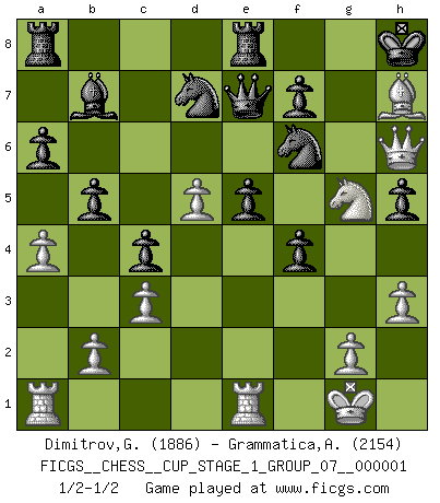 Last move : 1/2-1/2 2017 May 12 16:15:18 [Event "FICGS__CHESS__CUP_STAGE_1_GROUP_07__000001"] [Site "FICGS"] [Date "2017.03.01"] [Round "1"] [White "Dimitrov,George"] [Black "Grammatica,Andrea"] [Result "1/2-1/2"] [WhiteElo "1886"] [BlackElo "2154"] 1.e4 e5 2.Nf3 Nc6 3.Bb5 a6 4.Ba4 Nf6 5.O-O Be7 6.Re1 b5 7.Bb3 O-O 8.c3 d6 9.h3 Nb8 10.d4 Nbd7 11.Nbd2 Bb7 12.Bc2 Re8 13.Nf1 Bf8 14.Ng3 g6 15.a4 c5 16.d5 c4 17.Be3 Qc7 18.Nh2 h5 19.Qd2 Nc5 20.Nf3 Bg7 21.Bh6 Bxh6 22.Qxh6 Qe7 23.Ng5 Ncd7 24.f4 exf4 25.Nxh5 gxh5 26.e5 dxe5 27.Bh7+ Kh8 1/2-1/2 Ruy Lopez : Closed, 7...O-O Kingside Castling by player White (move 5) Kingside Castling by player Black (move 7) This chess game ended in a draw. Follow this game move after move (download)Fischer is under obligation to nobody. (Joseph Platz) Ein Kibitz ist einer, der deinem Gegner gute Ratschläge gibt. (Andrew Soltis) Los Peones son nacidos libres, y aún así, se encuentran encadenados por todos lados. (Rick Kennedy) Shah mat. Le roi est mort. Cri de fierté d'un joueur venant de terrasser son adversaire, courtoisement, sans effusion de sang. In my experience, there's no such thing as luck. (Obi-Wan Kenobi in Star Wars ep.4)