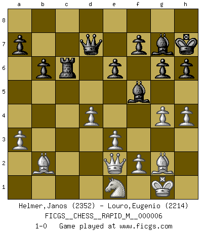 Last move : 1-0 2007 June 27 4:12:59 [Event "FICGS__CHESS__RAPID_M__000006"] [Site "FICGS"] [Date "2007.04.04"] [Round "1"] [White "Helmer,Janos"] [Black "Louro,Eugenio"] [Result "1-0"] [WhiteElo "2352"] [BlackElo "2214"] 1.Nf3 Nf6 2.c4 c5 3.Nc3 d5 4.cxd5 Nxd5 5.g3 g6 6.Bg2 Bg7 7.O-O O-O 8.d4 Nxc3 9.bxc3 cxd4 10.cxd4 Nc6 11.e3 Be6 12.Qe2 Rc8 13.Bb2 Nb4 14.Rfc1 Rxc1+ 15.Bxc1 Qd7 16.a3 Nc6 17.Bb2 Rc8 18.Rc1 h6 19.Ne1 Bg4 20.Qb5 Bf5 21.Rc5 Kh7 22.h4 e6 23.Qe2 b6 24.Rxc6 Rxc6 25.g4 1-0 Reti Opening Kingside Castling by player White (move 7) Kingside Castling by player Black (move 7) Player White won this chess game. Follow this game move after move (download)The older I grow, the more I value Pawns. (Keres) Die jungen Leute sollen verstehen, dass sie noch etwas von mir lernen können und müssen. (Viktor Kortschnoi) ¿Esta Bobby Fischer algo cuerdo?. (Salo Flohr) Tout change constamment, y compris dans le monde des Echecs. (Botvinnik) The weakness of an artist is dogma. (Josh Waitzkin)