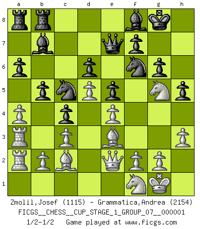 Last move : 1/2-1/2 2017 June 28 14:17:34 [Event "FICGS__CHESS__CUP_STAGE_1_GROUP_07__000001"] [Site "FICGS"] [Date "2017.03.01"] [Round "1"] [White "Zmolil,Josef"] [Black "Grammatica,Andrea"] [Result "1/2-1/2"] [WhiteElo "1115"] [BlackElo "2154"] 1.e4 e5 2.Nf3 Nc6 3.Bb5 a6 4.Ba4 Nf6 5.O-O Be7 6.Re1 b5 7.Bb3 d6 8.c3 O-O 9.h3 Nb8 10.d4 Nbd7 11.Nbd2 Bb7 12.Bc2 Re8 13.Nf1 Bf8 14.Ng3 g6 15.a4 c5 16.d5 c4 17.Bg5 Nc5 18.Ra3 Be7 19.Be3 Qc7 20.Qe2 Reb8 21.Rea1 Kg7 22.Bg5 Kg8 23.R1a2 h5 24.Nf1 Qd8 25.Bc1 Qc7 26.Ng5 Bf8 27.Be3 Qe7 1/2-1/2 Ruy Lopez : Closed Kingside Castling by player White (move 5) Kingside Castling by player Black (move 8) This chess game ended in a draw. Follow this game move after move (download)Every Chess master was once a beginner. (Chernev) Ja, jede Frau in Holland liebt mich bestimmt, und alle Männer hassen mich. (Loek van Wely) El juego del Ajedrez no es solamente una diversión quieta; algunas cualidades muy valuables de la mente se pueden adquirir y cultivar con el, como convertirlos en habitos disponibles para toda ocasión; ya que la vida es algo así como el Ajedrez. (Benjamin Franklin) Votre seul travail dans les ouvertures est d'obtenir un milieu de partie jouable. (Lajos Portish) There are two major products that came out of Berkeley: LSD and UNIX. We do not believe this is to be a coincidence. (Jeremy S. Anderson)