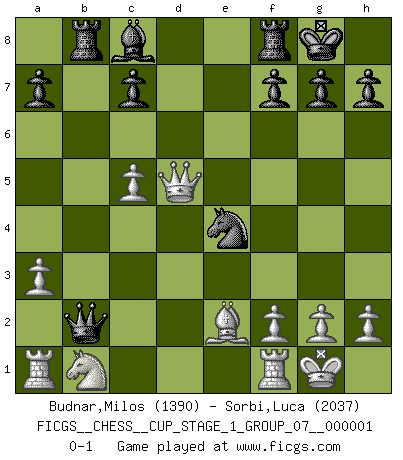 Last move : 0-1 2017 May 19 6:44:41 [Event "FICGS__CHESS__CUP_STAGE_1_GROUP_07__000001"] [Site "FICGS"] [Date "2017.03.01"] [Round "1"] [White "Budnar,Milos"] [Black "Sorbi,Luca"] [Result "0-1"] [WhiteElo "1390"] [BlackElo "2037"] 1.e4 e5 2.Nf3 Nf6 3.Nxe5 d6 4.Nf3 Nxe4 5.d4 d5 6.Bd3 Nc6 7.O-O Be7 8.c4 Nb4 9.Be2 O-O 10.c5 b6 11.a3 Nc6 12.Be3 bxc5 13.dxc5 Bf6 14.Nd4 Nxd4 15.Bxd4 Rb8 16.Bxf6 Qxf6 17.Qxd5 Qxb2 0-1 Petrov : Classical attack Kingside Castling by player White (move 7) Kingside Castling by player Black (move 9) Player Black won this chess game. Follow this game move after move (download)Chess, like any creative activity, can exist only through the combined efforts of those who have creative talent, and those who have the ability to organize their creative work. (Mikhail Botvinnik) Kein Schachspieler kann gut schlafen. (H. G. Wells) La esencia del Ajedrez es pensar acerca de lo que el Ajedrez es. (David Bronstein) Les échecs, c'est la lutte contre l'erreur. (Johannes Zukertort) If you are good, you will be assigned all the work. If you are really good, you will get out of it. (Dan Rotaru)