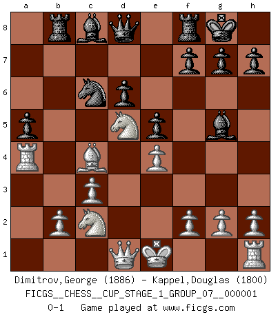 Last move : 0-1 2017 April 27 1:2:50 [Event "FICGS__CHESS__CUP_STAGE_1_GROUP_07__000001"] [Site "FICGS"] [Date "2017.03.01"] [Round "1"] [White "Dimitrov,George"] [Black "Kappel,Douglas"] [Result "0-1"] [WhiteElo "1886"] [BlackElo "1800"] 1.e4 c5 2.Nf3 Nc6 3.d4 cxd4 4.Nxd4 Nf6 5.Nc3 e5 6.Ndb5 d6 7.Bg5 a6 8.Na3 b5 9.Nd5 Be7 10.Bxf6 Bxf6 11.c3 Bg5 12.Nc2 O-O 13.a4 bxa4 14.Rxa4 a5 15.Bc4 Rb8 0-1 This chess game has been lost on time (started : 2017.03.01 0:58:43) Sicilian : Pelikan (Lasker/Sveshnikov) variation Kingside Castling by player Black (move 12) Player Black won this chess game. Follow this game move after move (download)A thorough understanding of the typical mating continuations makes the most complicated sacrificial combinations leading up to them not only not difficult, but almost a matter of course. (Siegbert Tarrasch) Alle Schachspieler sollten auch ein Hobby haben. (Savielly Grigorievitsch Tartakower) Me siento como si fuera una pieza en una partida de Ajedrez, cuando mi oponente me indica: esa pieza no puede ser movida. (Soren Kierkegaard) Le génie consiste à savoir transgresser les règles au moment opportun. (Teichmann) Luck never gives; it only lends. (Swedish proverb)