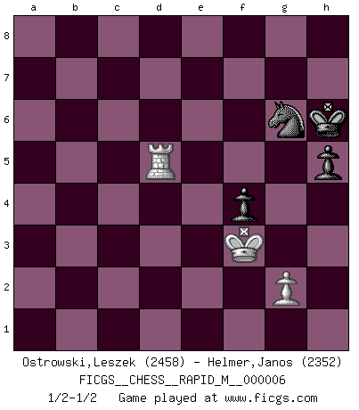 Last move : 1/2-1/2 2007 September 2 1:52:13 [Event "FICGS__CHESS__RAPID_M__000006"] [Site "FICGS"] [Date "2007.04.04"] [Round "1"] [White "Ostrowski,Leszek"] [Black "Helmer,Janos"] [Result "1/2-1/2"] [WhiteElo "2458"] [BlackElo "2352"] 1.e4 c5 2.Nf3 Nc6 3.d4 cxd4 4.Nxd4 Nf6 5.Nc3 d6 6.f3 e5 7.Nb3 Be6 8.Nd5 Bxd5 9.exd5 Nb8 10.Be3 Be7 11.c4 O-O 12.Bd3 Nfd7 13.Qd2 f5 14.O-O Na6 15.Na5 Qc8 16.b4 Bd8 17.Nb3 Bb6 18.Rae1 Bxe3+ 19.Rxe3 f4 20.Re2 b6 21.a3 Nc7 22.c5 bxc5 23.bxc5 Rb8 24.Na5 Nxc5 25.Nc6 Qd7 26.Nxb8 Rxb8 27.Qc2 Nxd3 28.Qxd3 Qb5 29.Rd2 Qxd3 30.Rxd3 Rb5 31.Rfd1 Kf7 32.a4 Ra5 33.Rb1 Rxa4 34.Rb7 Rc4 35.Rxa7 Kf6 36.Ra5 g5 37.Rb3 e4 38.fxe4 Ke5 39.Rb8 Kxe4 40.Rc8 Rc3 41.Ra6 Rc1+ 42.Kf2 Rc2+ 43.Kf1 Rc1+ 44.Ke2 Rc2+ 45.Ke1 Rc1+ 46.Kd2 Rc5 47.Rxd6 Rxd5+ 48.Rxd5 Nxd5 49.Rc4+ Kf5 50.Ke2 h5 51.Rc8 Ke4 52.h4 gxh4 53.Rc4+ Kf5 54.Kf3 Ke5 55.Rc5 Kd6 56.Rc1 Ke5 57.Rh1 Kf5 58.Rxh4 Kg5 59.Rh1 Ne7 60.Rb1 Ng6 61.Rb5+ Kh6 62.Rd5 1/2-1/2 Sicilian defense Kingside Castling by player Black (move 11) Kingside Castling by player White (move 14) 10 pieces endgame at move 48 : White KRRPP , Black KNPPP WHITE : King + 2 Rooks 2 Pawns BLACK : King + 1 Knight 3 Pawns 9 pieces endgame at move 48 : White KRPP , Black KNPPP WHITE : King + 1 Rook 2 Pawns BLACK : King + 1 Knight 3 Pawns 8 pieces endgame at move 52 : White KRP , Black KNPPP WHITE : King + 1 Rook 1 Pawn BLACK : King + 1 Knight 3 Pawns 7 pieces endgame at move 58 : White KRP , Black KNPP WHITE : King + 1 Rook 1 Pawn BLACK : King + 1 Knight 2 Pawns This chess game ended in a draw. Follow this game move after move (download)Chess is a fairy tale of 1001 blunders. (Savielly Tartakower) Schach verlangt totale Konzentration. (Robert James Fischer) La enorme capacidad mental, en la que sin ella no puede un jugador de Ajedrez existir, es demasiado requerida por el Ajedrez al grado de que nunca podrá liberar su mente de este juego. (Albert Einstein) La conception d'un plan est le processus par lequel un joueur exploite les avantages de sa position tout en s'efforçant d'en réduire au minimum les inconvénients. Afin de garantir le succès, un plan doit toujours se fonder sur un diagnostic objectif des particularités d'une position. La conception d'un plan est d'autant plus difficile que la position est équilibrée, et grandement facilitée lorsqu'il n'existe qu'un seul plan susceptible de répondre aux exigences de la position. (Harry Golombek) Creativity involves breaking out of established patterns in order to look at things in a different way. (Edward De Bono)