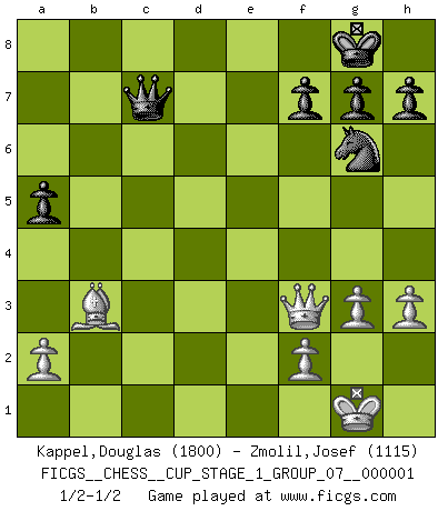 Last move : 1/2-1/2 2017 June 3 17:13:28 [Event "FICGS__CHESS__CUP_STAGE_1_GROUP_07__000001"] [Site "FICGS"] [Date "2017.03.01"] [Round "1"] [White "Kappel,Douglas"] [Black "Zmolil,Josef"] [Result "1/2-1/2"] [WhiteElo "1800"] [BlackElo "1115"] 1.Nf3 d5 2.c4 e6 3.b3 Nf6 4.Bb2 Bd6 5.cxd5 exd5 6.g3 c6 7.Bg2 O-O 8.O-O Bg4 9.d3 Nbd7 10.Nbd2 Re8 11.Re1 Qb6 12.Qc2 Bb4 13.h3 Bxf3 14.Bxf3 Qa5 15.Red1 Ba3 16.e3 Bxb2 17.Qxb2 Qc7 18.b4 Ne5 19.Be2 a5 20.b5 c5 21.Bf1 Ng6 22.Bg2 Rac8 23.e4 dxe4 24.b6 Qe7 25.Re1 Qd7 26.Nxe4 Nxe4 27.Rxe4 Qxd3 28.Rxe8+ Rxe8 29.Bxb7 Re2 30.Qb1 Qd4 31.Qf1 Rb2 32.Rb1 c4 33.Rxb2 Qxb2 34.Bd5 Qxb6 35.Qxc4 Qa7 36.Qe2 Qd7 37.Qf3 Qc7 38.Bb3 1/2-1/2 Reti Opening Kingside Castling by player Black (move 7) Kingside Castling by player White (move 8) This chess game ended in a draw. Follow this game move after move (download)A win by an unsound combination, however showy, fills me with artistic horror. (Wilhelm Steinitz) Ich trinke, ich rauche, ich spiele, ich liebe Frauen aber Fernschach ist ein Laster, das ich nicht habe. (Mikhail Nekhemyevich Tal) Coloca el contenido del tablero de Ajedrez en un sombrero, agita las piezas vigorosamente, derrámalas en el tablero desde una altura de medio metro y así obtienes el estilo de Wilhelm Steinitz. (H. E. Bird) Il vaut mieux sacrifier les pièces de l'adversaire. (Xavier Tartacover) Do not put your faith in what statistics say until you have carefully considered what they do not say. (William W. Watt)