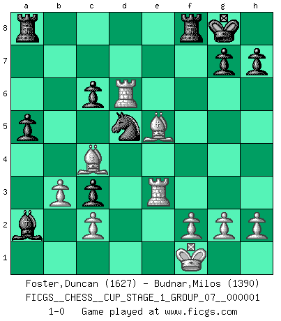 Last move : 1-0 2017 May 17 15:48:17 [Event "FICGS__CHESS__CUP_STAGE_1_GROUP_07__000001"] [Site "FICGS"] [Date "2017.03.01"] [Round "1"] [White "Foster,Duncan"] [Black "Budnar,Milos"] [Result "1-0"] [WhiteElo "1627"] [BlackElo "1390"] 1.e4 e5 2.Nf3 Nc6 3.d4 exd4 4.Nxd4 Bc5 5.Nxc6 Qf6 6.Qd2 Qxc6 7.Bd3 d5 8.Nc3 Qd6 9.Qg5 dxe4 10.Nxe4 Bb4+ 11.Ke2 Qe6 12.Qb5+ c6 13.Qxb4 f5 14.Re1 a5 15.Qd4 fxe4 16.Kf1 Nf6 17.Bf4 Qd5 18.Qc3 Be6 19.Be2 O-O 20.Be5 b5 21.Rad1 b4 22.Rxd5 bxc3 23.Rd6 Bxa2 24.b3 Nd5 25.Bc4 e3 26.Rxe3 1-0 Scotch game Kingside Castling by player Black (move 19) Player White won this chess game. Follow this game move after move (download)First-class players lose to second-class players because second-class players sometimes play a first-class game. (Siegbert Tarrasch) Nur ein wirklich starker Spieler weiß wie schwach er spielt. (Savielly Grigorievitsch Tartakower) Cuando estes solo, cuando te sientas un extraño en el mundo, juega al Ajedrez. Esto levantará tu espiritu y será tu consejero de guerra. (Aristóteles) Je ne suis pas le dernier à jouer lâchement des coups douteux pendant le zeïtnot de l'adversaire pour l'achever: en effet les coups qui font le plus peur sont ceux que l'on ne comprend pas. Je me fais souvent peur quand je joue. (Un professeur anonyme) Life is like a play: it's not the length but the excellence of the acting that matters. (Seneca)