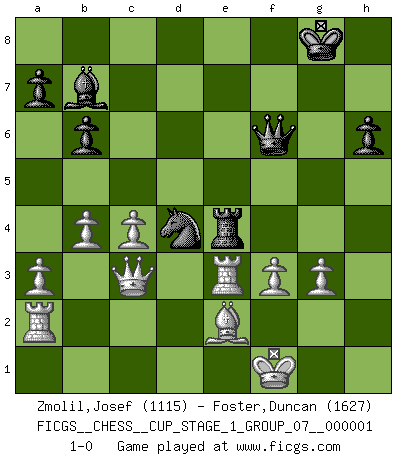 Last move : 1-0 2017 June 29 22:55:2 [Event "FICGS__CHESS__CUP_STAGE_1_GROUP_07__000001"] [Site "FICGS"] [Date "2017.03.01"] [Round "1"] [White "Zmolil,Josef"] [Black "Foster,Duncan"] [Result "1-0"] [WhiteElo "1115"] [BlackElo "1627"] 1.c4 b6 2.d4 Bb7 3.Nc3 e6 4.e4 Bb4 5.f3 f5 6.exf5 exf5 7.Bd3 Qh4+ 8.Kf1 Ne7 9.Nh3 O-O 10.Bg5 Qxd4 11.Nb5 Qe5 12.Bf4 Qf6 13.Nxc7 Nbc6 14.Nxa8 Rxa8 15.a3 Bc5 16.b4 Bd4 17.Ra2 h6 18.Bg3 g5 19.Nf2 Ne5 20.Be2 f4 21.Qxd4 fxg3 22.Nd3 d6 23.Qc3 Nf5 24.Nxe5 dxe5 25.Kg1 Nd4 26.hxg3 e4 27.Kf2 Re8 28.Rd1 e3+ 29.Kf1 Re4 30.Rd3 g4 31.Rxe3 gxf3 32.gxf3 1-0 English Opening Kingside Castling by player Black (move 9) Player White won this chess game. Follow this game move after move (download)The hardest game to win is a won game. (Emanuel Lasker) In Buenos Aires ist es nicht mein vorrangiges Ziel ein starkes Turnier zu organisieren, sondern ein Turnier für Gentlemen. Ich würde nie Kamsky einladen. Ich mag keine Probleme. (Miguel Najdorf) Si tu oponente no puede hacer nada activo, entonces no apures la posición; En vez de eso, dejalo estar sentado ahí, sufriendo y rogandote por un empate. (Jeremy Silman) Aux échecs, l'amour-propre est satisfait quand on remporte la victoire, mais il n'y a pas de honte à être battu. (Benjamin Franklin) You think that education is too expensive ? Try ignorance. (Derek Bok)