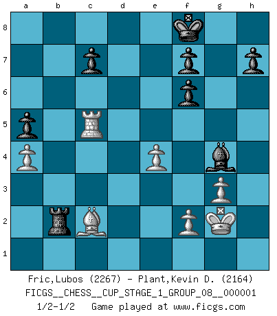 Last move : 1/2-1/2 2017 June 17 22:24:29 [Event "FICGS__CHESS__CUP_STAGE_1_GROUP_08__000001"] [Site "FICGS"] [Date "2017.03.01"] [Round "1"] [White "Fric,Lubos"] [Black "Plant,Kevin D."] [Result "1/2-1/2"] [WhiteElo "2267"] [BlackElo "2164"] 1.e4 e5 2.Nf3 Nc6 3.Bb5 a6 4.Ba4 Nf6 5.O-O Be7 6.Re1 b5 7.Bb3 O-O 8.a4 b4 9.d4 d6 10.dxe5 Nxe5 11.Nxe5 dxe5 12.Qe2 a5 13.Nd2 Bc5 14.Nc4 Ng4 15.Ne3 Qh4 16.h3 Nh6 17.Rd1 Ra6 18.Rd5 Bd4 19.c3 bxc3 20.bxc3 Bxc3 21.Bb2 Bxb2 22.Qxb2 Bxh3 23.Qxe5 Be6 24.Bc4 Rc6 25.g3 Qf6 26.Qxf6 gxf6 27.Rd4 Rc5 28.Rc1 Rb8 29.Rc2 Kf8 30.Kg2 Ng4 31.Nxg4 Bxg4 32.Rd5 Rc6 33.Bd3 Rxc2 34.Bxc2 Rb2 35.Rc5 1/2-1/2 Ruy Lopez : Closed, 7...O-O Kingside Castling by player White (move 5) Kingside Castling by player Black (move 7) This chess game ended in a draw. Follow this game move after move (download)The passed pawn is a criminal, who should be kept under lock and key. Mild measures, such as police surveillance, are not sufficient. (Nimzovitch) Ich habe kein Problem mit Frauen, sondern nur mit dem Niveau ihres Schachspiels (Judith Polgar) Con o sin el título, Bobby Fischer fue sin lugar a dudas el mas grande jugador de su época. (Burt Hochberg) Fischer est le meilleur joueur du monde et Karpov n'est qu'un joueur de bistrot. (Garry Kasparov, agé de 16 ans) Men should grow up. - Yeah. And dogs should stop licking themselves. It's not gonna happen. (Gregory House to Dr. Cameron, House M.D.)