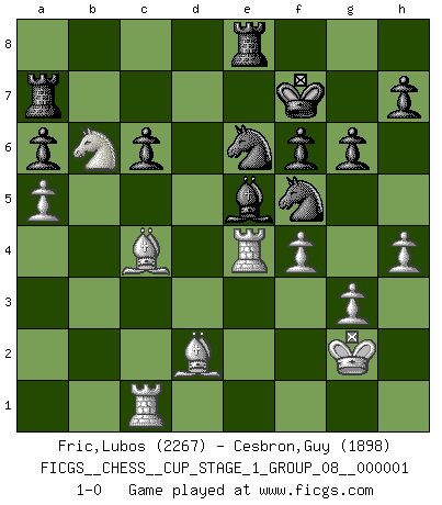 Last move : 1-0 2017 July 6 0:33:25 [Event "FICGS__CHESS__CUP_STAGE_1_GROUP_08__000001"] [Site "FICGS"] [Date "2017.03.01"] [Round "1"] [White "Fric,Lubos"] [Black "Cesbron,Guy"] [Result "1-0"] [WhiteElo "2267"] [BlackElo "1898"] 1.Nf3 d5 2.g3 Nf6 3.Bg2 c6 4.O-O Bg4 5.h3 Bxf3 6.Bxf3 Nbd7 7.d4 e5 8.c4 dxc4 9.Nd2 exd4 10.Nxc4 Nc5 11.b4 Ne6 12.Qb3 Qc7 13.b5 Bc5 14.Rb1 O-O 15.bxc6 bxc6 16.Qb7 Rac8 17.Qxc7 Rxc7 18.Bd2 Re8 19.Rfc1 Nd5 20.Ba5 R7c8 21.h4 f6 22.Bd2 Rc7 23.Kg2 Rec8 24.a4 Ne7 25.a5 a6 26.Be4 Re8 27.Bd3 Ra7 28.Nb6 Kf7 29.Bc4 Bd6 30.Rb3 g6 31.e4 dxe3 32.Rxe3 Nf5 33.Re4 Be5 34.f4 1-0 Reti : King's Indian attack, Yugoslav variation Kingside Castling by player White (move 4) Kingside Castling by player Black (move 14) Player White won this chess game. Follow this game move after move (download)Botvinnik tried to take the mystery out of Chess, always relating it to situations in ordinary life. He used to call Chess a typical inexact problem similar to those which people are always having to solve in everyday life. (Garry Kasparov) Schach ist ein Kampf gegen den Fehler. (Johannes Herrman Zukertort) Dios mío, Bobby Fischer juega tan simple. (Alexei Suetin) On est toujours la mazette de quelqu'un d'autre. (Anonyme) There's always a bigger fish. (Qui-Gon Jinn in Star Wars ep.1)