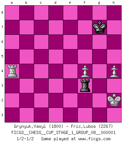 Last move : 1/2-1/2 2017 April 21 8:27:0 [Event "FICGS__CHESS__CUP_STAGE_1_GROUP_08__000001"] [Site "FICGS"] [Date "2017.03.01"] [Round "1"] [White "Grynyuk,Vasyl"] [Black "Fric,Lubos"] [Result "1/2-1/2"] [WhiteElo "1800"] [BlackElo "2267"] 1.e4 c5 2.Nf3 d6 3.d4 cxd4 4.Nxd4 Nf6 5.Nc3 a6 6.Bg5 Nbd7 7.f4 e5 8.Nf5 Qb6 9.Qd2 Qxb2 10.Rb1 Qa3 11.Be2 h6 12.Bh4 exf4 13.O-O g6 14.Rxf4 g5 15.Rb3 Qa5 16.Nxd6+ Bxd6 17.Qxd6 gxf4 18.Ra3 Qb6+ 19.Qxb6 Nxb6 20.Bxf6 Rg8 21.Rb3 Nd7 22.Nd5 b5 23.Bh4 Rb8 24.Rd3 Rg6 25.Nxf4 Rg5 26.Bxg5 hxg5 27.Nd5 Nc5 28.Nf6+ Ke7 29.Ng8+ Ke8 30.Rd5 Ne6 31.Bh5 Kf8 32.Nh6 Nf4 33.Rxg5 Nxh5 34.Rxh5 Kg7 35.Nf5+ Bxf5 36.Rxf5 Rc8 37.Rf3 Rxc2 38.Ra3 Re2 39.Rxa6 Rxe4 40.h3 b4 41.Kf2 Rc4 42.Kg3 Rc3+ 43.Kh2 b3 44.axb3 Rxb3 45.h4 f5 46.g3 f4 47.gxf4 Rf3 48.Ra4 1/2-1/2 Sicilian : Najdorf, 6.Bg5 Kingside Castling by player White (move 13) 10 pieces endgame at move 39 : White KRPPPP , Black KRPP WHITE : King + 1 Rook 4 Pawns BLACK : King + 1 Rook 2 Pawns 9 pieces endgame at move 39 : White KRPPP , Black KRPP WHITE : King + 1 Rook 3 Pawns BLACK : King + 1 Rook 2 Pawns 8 pieces endgame at move 44 : White KRPPP , Black KRP WHITE : King + 1 Rook 3 Pawns BLACK : King + 1 Rook 1 Pawn 7 pieces endgame at move 44 : White KRPP , Black KRP WHITE : King + 1 Rook 2 Pawns BLACK : King + 1 Rook 1 Pawn 6 pieces endgame at move 47 : White KRPP , Black KR WHITE : King + 1 Rook 2 Pawns BLACK : King + 1 Rook This chess game ended in a draw. Follow this game move after move (download)Strategy requires thought, tactics require observation. (Max Euwe) Die Arbeit ist etwas Unnatürliches. Die Faulheit allein ist göttlich. (Anatole France) No hay precio que no valga la pena por la cabellera del Rey enemigo. (Koblentz) Les pièces de l'échiquier étaient impitoyables. Elles le retenaient, elles l'absorbaient. Il y avait de l'horreur en cela, mais aussi une harmonie unique. Car, qu'y a-t-il dans le monde, à part les échecs ? (V. Nabokov) There is no instance of a country having benefited from prolonged warfare. (Sun Tzu)