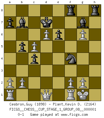 Last move : 0-1 2017 May 18 1:0:46 [Event "FICGS__CHESS__CUP_STAGE_1_GROUP_08__000001"] [Site "FICGS"] [Date "2017.03.01"] [Round "1"] [White "Cesbron,Guy"] [Black "Plant,Kevin D."] [Result "0-1"] [WhiteElo "1898"] [BlackElo "2164"] 1.d4 d5 2.c4 e6 3.Nc3 c6 4.Nf3 Nf6 5.Bg5 h6 6.Bh4 dxc4 7.e4 g5 8.Bg3 b5 9.Be2 Bb7 10.O-O Nbd7 11.Ne5 Bg7 12.Nxf7 Kxf7 13.e5 Nd5 14.Ne4 Ke7 15.Nd6 Qb6 16.Bg4 h5 17.Bxh5 Raf8 18.Qg4 Bh6 19.h4 c5 20.hxg5 Bg7 21.g6 N7f6 22.Bh4 Qxd6 23.exd6+ Kd7 24.Bxf6 Nxf6 25.Qd1 Nxh5 26.dxc5 Nf4 0-1 QGD : Semi-Slav Kingside Castling by player White (move 10) Player Black won this chess game. Follow this game move after move (download)Chess demands total concentration. (Bobby Fischer) Ich kenne Menschen, die allen Willen der Welt besitzen und doch nicht Schach spielen können. (Robert James Fischer) El Ajedrez, como la música, como el amor, tiene el poder de hacer feliz a la gente. (Siegbert Tarrasch) Les échecs, c'est la lutte contre l'erreur. (Johannes Zukertort) I believe in luck. How else can you explain the success of those you dislike ? (Jean Cocteau)