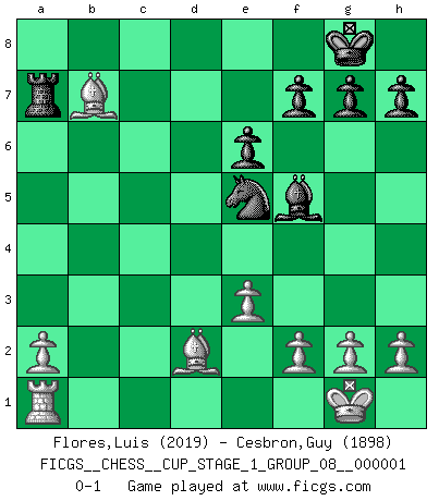 Last move : 0-1 2017 June 15 9:6:16 [Event "FICGS__CHESS__CUP_STAGE_1_GROUP_08__000001"] [Site "FICGS"] [Date "2017.03.01"] [Round "1"] [White "Flores,Luis"] [Black "Cesbron,Guy"] [Result "0-1"] [WhiteElo "2019"] [BlackElo "1898"] 1.d4 d5 2.c4 c6 3.Nf3 e6 4.Nc3 Nf6 5.e3 Nbd7 6.Qc2 Bd6 7.Bd3 O-O 8.O-O dxc4 9.Bxc4 a6 10.Rd1 b5 11.Bd3 Qc7 12.Bd2 c5 13.Ne4 c4 14.Nxd6 Qxd6 15.Be2 Bb7 16.b3 Rfc8 17.bxc4 bxc4 18.Rdc1 Bd5 19.Bc3 Be4 20.Qd2 Bf5 21.Ne5 Nxe5 22.dxe5 Qxd2 23.Bxd2 Nd7 24.Bxc4 Nxe5 25.Bxa6 Rd8 26.Bb7 Ra7 27.Rc8 Rxc8 28.Bxc8 Ra8 29.Bb7 Ra7 0-1 This chess game has been lost on time (started : 2017.03.01 0:58:45) QGD Slav : 3.Nf3 Kingside Castling by player Black (move 7) Kingside Castling by player White (move 8) Player Black won this chess game. Follow this game move after move (download)You have to have the fighting spirit. You have to force moves and take chances. (Bobby Fischer) Kombinieren und Schwarzhandel gehören verboten. (Savielly Grigorievitsch Tartakower) ¡Examina movidas que hagan daño! Un buen ojo for movidas desvastantes es mucho mas importante que el conocimiento de principios estratégicos. (Purdy) Botvinnik disait en comparant les échecs à la musique: Il existe une science dont le but est l'étude de l'acoustique et des sons. Mais il y a aussi un art qui se sert de l'océan des sons : c'est la musique. De toute évidence, il en est de même pour la pensée. La logique est l'étude des lois de la réflexion et les échecs reflètent, en tant qu'art, le côté logique de la réflexion, sous la forme d'images artistiques... Extrait de Fischer - Spassky, Reykjavik 1972 par Alexander & F. Wyndham (Ed. Solar), p 37. If you are going through hell, keep going. (Winston Churchill)