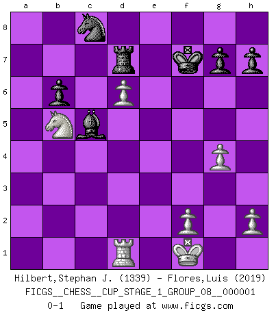 Last move : 0-1 2017 July 2 13:38:7 [Event "FICGS__CHESS__CUP_STAGE_1_GROUP_08__000001"] [Site "FICGS"] [Date "2017.03.01"] [Round "1"] [White "Hilbert,Stephan J."] [Black "Flores,Luis"] [Result "0-1"] [WhiteElo "1339"] [BlackElo "2019"] 1.e4 c5 2.b4 cxb4 3.a3 d5 4.exd5 Qxd5 5.Nf3 e5 6.c4 Qe6 7.Bd3 e4 8.O-O Qf6 9.Bxe4 Qxa1 10.Qb3 Qf6 11.Re1 Be7 12.Bb2 Qh6 13.Bd5 Nc6 14.axb4 a5 15.bxa5 Kf8 16.Nc3 Nxa5 17.Qa4 Qb6 18.Nb5 Ra6 19.Ng5 Nc6 20.Qd1 Nd8 21.Qe2 Ne6 22.Bxe6 Bxe6 23.Qe5 Bf6 24.Qb8+ Qd8 25.Ba3+ Rxa3 26.Nxe6+ fxe6 27.Qxd8+ Bxd8 28.Nxa3 Kf7 29.Rb1 b6 30.Nb5 Nh6 31.d4 Be7 32.Kf1 Rc8 33.Rc1 Nf5 34.g3 Rd8 35.Rd1 Bc5 36.d5 exd5 37.cxd5 Ne7 38.d6 Rd7 39.g4 Nc8 0-1 Sicilian : wing gambit, Marshall variation Kingside Castling by player White (move 8) Player Black won this chess game. Follow this game move after move (download)Live, lose, and learn, by observing your opponent how to win. (Amber Steenbock) Modernes Schach erfordert enorme Anspannung. Es ist für einen normalen Menschen unmöglich das auszuhalten. (Viktor Kortschnoi) Nos gusta pensar. (Gary Kasparov) Le joueur d'Echecs qui veut atteindre le top est obligé de développer son propre credo créatif. Alexeï Stepanovicth Souétine. Il est facile d'écrire des livres ! Ce qui est difficile, c'est de jouer ! (Alexeï Stepanovicth Souétine) Coffee just isn't my cup of tea. (Unknown)
