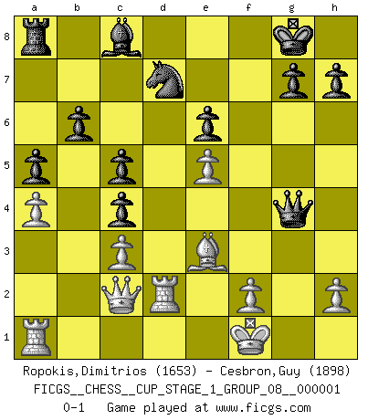 Last move : 0-1 2017 May 17 4:19:22 [Event "FICGS__CHESS__CUP_STAGE_1_GROUP_08__000001"] [Site "FICGS"] [Date "2017.03.01"] [Round "1"] [White "Ropokis,Dimitrios"] [Black "Cesbron,Guy"] [Result "0-1"] [WhiteElo "1653"] [BlackElo "1898"] 1.d4 d5 2.c4 c6 3.Nc3 Nf6 4.Nf3 e6 5.Bg5 dxc4 6.a4 Bb4 7.e4 Bxc3+ 8.bxc3 Qa5 9.e5 Ne4 10.Bd2 Qd5 11.Be3 Nd7 12.Qc2 O-O 13.Be2 f6 14.O-O b6 15.Rfd1 a5 16.Nd2 Nxd2 17.Rxd2 fxe5 18.Bf3 Rxf3 19.gxf3 Qxf3 20.dxe5 Qg4+ 21.Kf1 c5 0-1 This chess game has been lost on time (started : 2017.03.01 0:58:45) QGD Slav defense Kingside Castling by player Black (move 12) Kingside Castling by player White (move 14) Player Black won this chess game. Follow this game move after move (download)To avoid losing a piece, many a person has lost the game. (Savielly Tartakover) Ich tröste mich mit dem Vergnügen, daß Schachfans, Zuschauer und Leser glücklich sind, wenn ein Großmeister etwas riskiert, statt nur Klötzchen zu schieben. (Mikhail Nekhemyevich Tal) Un jugador que trata de regresar una movida en el Ajedrez es un futuro carterista. (Richard Fenton) Horreur, mais aussi harmonie suprême : qu'y avait-il en effet au monde en dehors des échecs ? Le brouillard, l'inconnu, le non-être... (Vladimir Nabokov) Fame, I have already. Now I need the money. (an elderly Steinitz)