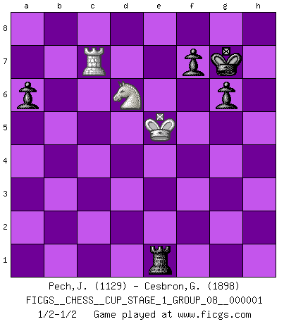 Last move : 1/2-1/2 2017 August 18 16:29:0 [Event "FICGS__CHESS__CUP_STAGE_1_GROUP_08__000001"] [Site "FICGS"] [Date "2017.03.01"] [Round "1"] [White "Pech,Jaroslav senior"] [Black "Cesbron,Guy"] [Result "1/2-1/2"] [WhiteElo "1129"] [BlackElo "1898"] 1.e4 c5 2.Nf3 e6 3.d4 cxd4 4.Nxd4 Nc6 5.Nc3 Nf6 6.Be2 d6 7.Be3 Be7 8.O-O O-O 9.f4 Bd7 10.Nb3 a6 11.a4 b6 12.Bf3 Qc7 13.Kh1 Bc8 14.g4 Bb7 15.g5 Nd7 16.Qe2 Rfe8 17.Rad1 Nb4 18.Qf2 Rac8 19.Bg2 Bf8 20.h4 d5 21.f5 exf5 22.Qxf5 Ne5 23.exd5 g6 24.Qf4 Nc4 25.Qxc7 Rxc7 26.Bf4 R7c8 27.d6 Bxg2+ 28.Kxg2 Bxd6 29.Bxd6 Nxc2 30.Kg1 N2e3 31.Rd4 Nxf1 32.Kxf1 Ne3+ 33.Kf2 Nf5 34.Rd5 Rc4 35.Nd2 Rxh4 36.Be5 h6 37.Nce4 Rxe5 38.Rxe5 hxg5 39.a5 bxa5 40.Nxg5 Rb4 41.b3 a4 42.bxa4 Rxa4 43.Nde4 Ra2+ 44.Kf3 Ra3+ 45.Kf4 Ra4 46.Rd5 Rd4 47.Rc5 Nd6 48.Ke5 Nxe4 49.Nxe4 Rb4 50.Nd6 Rb1 51.Rc8+ Kg7 52.Rc7 Re1+ 1/2-1/2 Sicilian : Taimanov variation Kingside Castling by player White (move 8) Kingside Castling by player Black (move 8) 10 pieces endgame at move 42 : White KRNN , Black KRNPPP WHITE : King + 1 Rook 2 Knights BLACK : King + 1 Rook 1 Knight 3 Pawns 9 pieces endgame at move 48 : White KRN , Black KRNPPP WHITE : King + 1 Rook 1 Knight BLACK : King + 1 Rook 1 Knight 3 Pawns 8 pieces endgame at move 49 : White KRN , Black KRPPP WHITE : King + 1 Rook 1 Knight BLACK : King + 1 Rook 3 Pawns This chess game ended in a draw. Follow this game move after move (download)Chess mastery essentially consists of analyzing Chess positions accurately. (Mikhail Botvinnik) Ich habe die besten Aussichten, den ersten Preis zu gewinnen - denn jeder muss gegen Steinitz spielen, nur ich nicht! (Wilhelm Steinitz) En la perfecta combinación de Ajedrez como en una historia corta de primera clase, toda la trama y contra trama deberá conducir hacia un final sorprendente, el interes no es mitigado hasta el último momento. (Yates and Winter) L'attaque fait le spectacle, la défense gagne les matchs. (Dicton footballistique) A generalist learns less and less about more and more until he knows nothing about everything. (Author unknown)