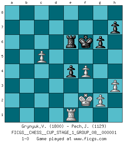 Last move : 1-0 2017 June 10 21:20:43 [Event "FICGS__CHESS__CUP_STAGE_1_GROUP_08__000001"] [Site "FICGS"] [Date "2017.03.01"] [Round "1"] [White "Grynyuk,Vasyl"] [Black "Pech,Jaroslav senior"] [Result "1-0"] [WhiteElo "1800"] [BlackElo "1129"] 1.e4 e5 2.Nf3 Nc6 3.Bb5 a6 4.Ba4 Nf6 5.O-O Be7 6.Re1 b5 7.Bb3 O-O 8.c3 d6 9.h3 Nd7 10.d4 Bb7 11.Nbd2 exd4 12.cxd4 Re8 13.Nf1 Bf6 14.Qd2 Nb6 15.Ng3 Nc4 16.Bxc4 bxc4 17.Nh5 a5 18.a3 Be7 19.Qf4 g6 20.Qg4 Bc8 21.Qg3 Kh8 22.Nf4 Bf6 23.e5 Bg7 24.Ng5 Kg8 25.Qf3 Qd7 26.e6 fxe6 27.Rxe6 Rxe6 28.Ngxe6 Bb7 29.Qd5 Qf7 30.Qb5 Rb8 31.d5 Nd4 32.Qxc4 c5 33.Be3 Be5 34.Re1 Re8 35.Bxd4 Bxd4 36.b4 axb4 37.axb4 Be5 38.Nd3 Bxd5 39.Qxd5 Qxe6 40.Qxe6+ Rxe6 41.Nxe5 dxe5 42.bxc5 Kf7 43.f3 Kf6 44.f4 e4 45.Kf2 1-0 Ruy Lopez : Closed, 7...O-O Kingside Castling by player White (move 5) Kingside Castling by player Black (move 7) Player White won this chess game. Follow this game move after move (download)The tactician knows what to do when there is something to do; whereas the strategian knows what to do when there is nothing to do. (Gerald Abrahams) Im Reiche der Wirklichkeit ist man nie so glücklich wie im Reiche der Gedanken. (Arthur Schopenhauer) Por tratar de evitar la pérdida de una pieza, muchas personas han perdido una partida de Ajedrez. (Savielly Tartakover) Votre seul travail dans les ouvertures est d'obtenir un milieu de partie jouable. (Lajos Portish) An expert is a man who has made all the mistakes which can be made in a very narrow field. (Niels Bohr)