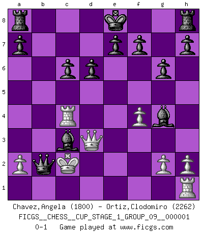Last move : 0-1 2017 April 2 13:19:23 [Event "FICGS__CHESS__CUP_STAGE_1_GROUP_09__000001"] [Site "FICGS"] [Date "2017.03.01"] [Round "1"] [White "Chavez,Angela"] [Black "Ortiz,Clodomiro"] [Result "0-1"] [WhiteElo "1800"] [BlackElo "2262"] 1.e4 g6 2.d4 Bg7 3.Bd3 Bxd4 4.Nf3 Bg7 5.Nc3 d6 6.Be3 Nf6 7.Nd4 Ng4 8.f3 Nxe3 9.Qe2 Bxd4 10.Nd5 Nxd5 11.exd5 Bxb2 12.Rb1 Bc3+ 13.Kd1 Nd7 14.Rb3 Bf6 15.f4 Nc5 16.Rb5 c6 17.dxc6 bxc6 18.Rb4 Qa5 19.c3 Bxc3 20.Rc4 Nxd3 21.Qxd3 Bg4+ 22.Kc1 Qa3+ 23.Kc2 Qb2+ 0-1 Robatsch (Modern) defense Player Black won this chess game. Follow this game move after move (download)The winner of the game is the player who makes the next-to-last mistake. (Savielly Tartakover) Mit Schach schule ich mein Gefühl für Geometrie, was für Tennis und Schach gleichermaßen wichtig ist. (Boris Becker) Nos gusta pensar. (Gary Kasparov) Toutes choses étant égales, c'est la conviction qui gagne. Alliée à une volonté de vaincre, elle sert de détonateur, suscite des idées, disperse les doutes et aide à penser clairement. (Robert Fischer) There will be no order, only chaos. (Sol Robeson in Pi by Darren Aronofsky)