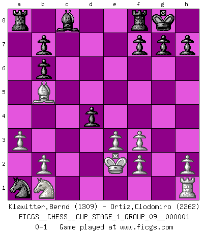 Last move : 0-1 2017 March 11 15:56:51 [Event "FICGS__CHESS__CUP_STAGE_1_GROUP_09__000001"] [Site "FICGS"] [Date "2017.03.01"] [Round "1"] [White "Klawitter,Bernd"] [Black "Ortiz,Clodomiro"] [Result "0-1"] [WhiteElo "1309"] [BlackElo "2262"] 1.d4 Nf6 2.Bg5 d5 3.Bf4 c5 4.c3 cxd4 5.cxd4 Qb6 6.Bc1 e5 7.dxe5 Ng4 8.e3 Nxe5 9.Qd4 Nbc6 10.Qxb6 axb6 11.a3 d4 12.Bb5 Bb4+ 13.Bd2 O-O 14.Bxb4 Nxb4 15.Nf3 Nxf3+ 16.gxf3 Nc2+ 17.Ke2 Nxa1 0-1 Trompowsky attack (Ruth, Opovcensky Opening) Kingside Castling by player Black (move 13) Player Black won this chess game. Follow this game move after move (download)Robert Fischer is a law unto himself. (Larry Evans) Im Spitzenschach von heute geht es nur um Vorbereitung, um tiefgründige, sorgfältige Eröffnungsvorbereitung. (Nigel Short) El Ajedrez es un invernadero donde los frutos del carácter pueden madurar mas completamente que en la vida. (Edward Morgan Foster) Même si l'adversaire joue le coup analysé précédemment, recommencez l'analyse en voyant la nouvelle position. Première règle de Blumenfeld Even the best needles are not sharp at both ends. (Chinese proverb)