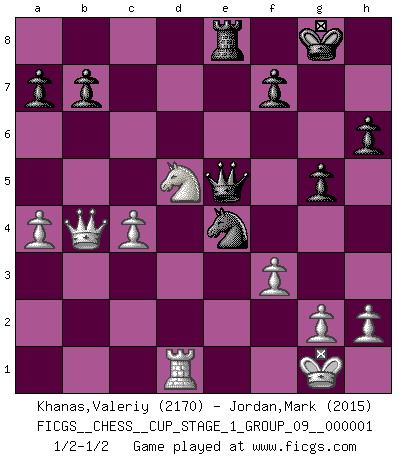 Last move : 1/2-1/2 2017 March 24 4:26:18 [Event "FICGS__CHESS__CUP_STAGE_1_GROUP_09__000001"] [Site "FICGS"] [Date "2017.03.01"] [Round "1"] [White "Khanas,Valeriy"] [Black "Jordan,Mark"] [Result "1/2-1/2"] [WhiteElo "2170"] [BlackElo "2015"] 1.d4 d5 2.c4 e6 3.Nc3 c6 4.Nf3 dxc4 5.a4 Bb4 6.e4 Nf6 7.Bg5 Qa5 8.Bd2 c5 9.Bxc4 cxd4 10.Nxd4 Nc6 11.Nc2 O-O 12.Nxb4 Qxb4 13.b3 Qe7 14.Qc2 Nb4 15.Qb2 e5 16.Bg5 Be6 17.O-O h6 18.Bh4 Rfd8 19.Rad1 g5 20.Bg3 Rac8 21.Bxe5 Bxc4 22.bxc4 Qxe5 23.Qxb4 Rxd1 24.Rxd1 Nxe4 25.Nd5 Re8 26.f3 1/2-1/2 QGD : Semi-Slav, Noteboom variation Kingside Castling by player Black (move 11) Kingside Castling by player White (move 17) This chess game ended in a draw. Follow this game move after move (download)Chess is like life. (Boris Spassky) Um sich vor der Gefahr einer Erkältung zu schützen, sorge der wanderlustige König beizeiten für ein brauchbares Versteck. (Aaron Nimzowitsch) El Ajedrez es un cuento de Hadas de las 1001 metidas de pata. (Savielly Tartakower) La menace est plus forte que l'exécution. (Aaron Nimzovitch) The question of whether computers can think is just like question of whether submarines can swim. (Edsger W. Dijkstra)