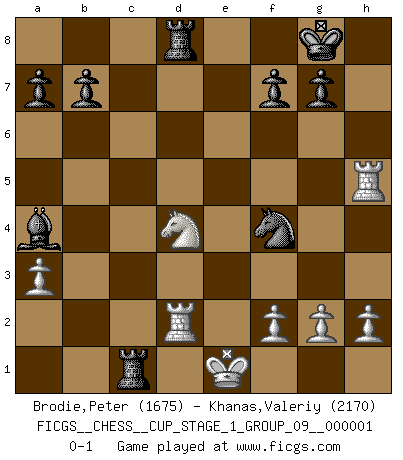 Last move : 0-1 2017 April 8 19:41:35 [Event "FICGS__CHESS__CUP_STAGE_1_GROUP_09__000001"] [Site "FICGS"] [Date "2017.03.01"] [Round "1"] [White "Brodie,Peter"] [Black "Khanas,Valeriy"] [Result "0-1"] [WhiteElo "1675"] [BlackElo "2170"] 1.d4 Nf6 2.Bf4 d5 3.Nf3 c5 4.c4 cxd4 5.Nxd4 Nbd7 6.e3 e5 7.Nc3 exf4 8.exf4 Bb4 9.a3 Bxc3+ 10.bxc3 Qa5 11.Qe2+ Ne4 12.Qc2 O-O 13.Bd3 Qxc3+ 14.Qxc3 Nxc3 15.Kd2 dxc4 16.Bxh7+ Kxh7 17.Kxc3 Rd8 18.Rhe1 Nb6 19.Rad1 Bd7 20.Re5 Ba4 21.Rh5+ Kg8 22.Rd2 Nd5+ 23.Kxc4 Rac8+ 24.Kd3 Rc3+ 25.Ke2 Nxf4+ 26.Ke1 Rc1+ 0-1 Queen's pawn game Kingside Castling by player Black (move 12) Player Black won this chess game. Follow this game move after move (download)You can only get good at Chess if you love the game. (Bobby Fischer) Computer sind die einzigen Gegner, die nicht immer eine Ausrede auf Lager haben, wenn sie gegen mich verlieren. (Robert James Fischer) El Ajedrez es imaginación. (David Bronstein) Aux échecs, l'amour-propre est satisfait quand on remporte la victoire, mais il n'y a pas de honte à être battu. (Benjamin Franklin) All the troubles of the world come from being unable to sit alone in a quiet room. (Blaise Pascal)