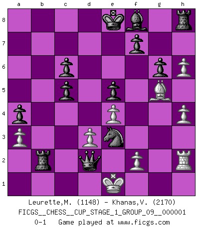 Last move : 0-1 2017 March 11 13:9:34 [Event "FICGS__CHESS__CUP_STAGE_1_GROUP_09__000001"] [Site "FICGS"] [Date "2017.03.01"] [Round "1"] [White "Leurette,Marc-Antoine"] [Black "Khanas,Valeriy"] [Result "0-1"] [WhiteElo "1148"] [BlackElo "2170"] 1.e4 c5 2.Nc3 Nc6 3.Nf3 g6 4.Bb5 Bg7 5.Bxc6 dxc6 6.d3 Nf6 7.Be3 b6 8.h3 Qc7 9.Qd2 e5 10.O-O-O h6 11.Kb1 a5 12.g4 a4 13.a3 Nd7 14.h4 Nf8 15.g5 Bg4 16.Qe2 Ne6 17.gxh6 Bf8 18.Rdg1 Bh5 19.Bg5 Nd4 20.Qe3 Bxf3 21.Rh2 b5 22.Re1 b4 23.Nd1 bxa3 24.bxa3 Bxd1 25.Rxd1 Rb8+ 26.Kc1 Qb6 27.Kd2 Qa5+ 28.c3 Rb2+ 29.Ke1 Nc2+ 30.Kd2 Nxe3 31.Ke1 Qxc3+ 32.Rd2 Qxd2+ 0-1 Sicilian : Closed, 2...Nc6 Queenside Castling by player White (move 10) Player Black won this chess game. Follow this game move after move (download)Chess is a beautiful mistress. (Bent Larsen) Man gibt nur Pakete auf. (Paul Keres) Durante una competencia de Ajedrez, un Maestro de Ajedrez deberá ser una combinación de presa de caza y un Monge. (Alexander Alekhine) Les ravages du H expliquent la différence de niveau entre Tal et Thal [Abergel]. To send light into the darkness of men's hearts - such is the duty of the artist. (Schumann)