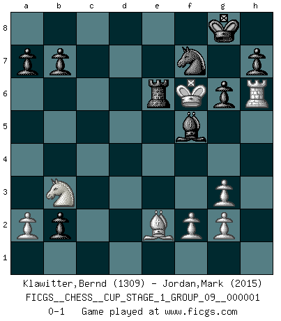 Last move : 0-1 2017 March 26 6:38:49 [Event "FICGS__CHESS__CUP_STAGE_1_GROUP_09__000001"] [Site "FICGS"] [Date "2017.03.01"] [Round "1"] [White "Klawitter,Bernd"] [Black "Jordan,Mark"] [Result "0-1"] [WhiteElo "1309"] [BlackElo "2015"] 1.d4 d5 2.Bf4 c5 3.c3 Nc6 4.e3 Nf6 5.Qc2 Nh5 6.Bg3 Nxg3 7.hxg3 g6 8.Nh3 cxd4 9.exd4 Bg7 10.Nd2 O-O 11.Be2 e5 12.dxe5 Nxe5 13.O-O-O Bf5 14.Qa4 d4 15.Nb3 dxc3 16.Rxd8 cxb2+ 17.Kd2 Raxd8+ 18.Ke3 Rfe8 19.Qxe8+ Rxe8 20.Kf4 Bh6+ 21.Ng5 f6 22.Rxh6 fxg5+ 23.Kxg5 Nf7+ 24.Kf6 Re6+ 0-1 Queen's pawn, Mason variation, Steinitz counter-gambit Kingside Castling by player Black (move 10) Queenside Castling by player White (move 13) Player Black won this chess game. Follow this game move after move (download)One doesn't have to play well, it's enough to play better than your opponent. (Siegbert Tarrasch) Ein Gewinn durch eine ungenaue Kombination, sei sie auch noch so vorzeigbar, erfüllt mich mit Schaudern. (Wilhelm Steinitz) El jugador blanco perdió porque fallo en recordar la coreccta continuación y tuvo que pensar por sí mismo las movidas. (Siegbert Tarrasch) Ne tendez aucun piège pour le plaisir ! Ne jouez rien dans l'espoir que l'adversaire réagisse de façon stupide ! Prenez toujours pour acquis que l'adversaire va trouver le meilleur coup ! Ne jouez jamais de coup dans l'espoir que l'adversaire ne voie pas la menace ! Chacun de vos coups doit améliorer la position d'une façon ou d'une autre. All maxims have their antagonist maxims; proverbs should be sold in pairs, a single one being but a half truth. (William Mathews)