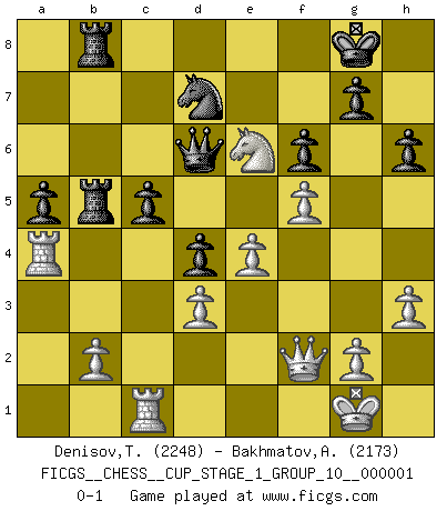 Last move : 0-1 2017 May 14 5:19:50 [Event "FICGS__CHESS__CUP_STAGE_1_GROUP_10__000001"] [Site "FICGS"] [Date "2017.03.01"] [Round "1"] [White "Denisov,Timofey"] [Black "Bakhmatov,Andrey"] [Result "0-1"] [WhiteElo "2248"] [BlackElo "2173"] 1.e4 e5 2.Nf3 Nc6 3.Bc4 Bc5 4.c3 Nf6 5.d3 a6 6.O-O d6 7.Nbd2 Ba7 8.Bb3 O-O 9.h3 h6 10.Re1 Be6 11.Bc2 Re8 12.Nf1 d5 13.Be3 Bxe3 14.Nxe3 d4 15.Nf1 Qd6 16.Ng3 Nd7 17.Ne2 b5 18.Qd2 a5 19.cxd4 Nxd4 20.Nfxd4 exd4 21.f4 f6 22.f5 Bf7 23.Bb3 c5 24.Bxf7+ Kxf7 25.a4 Reb8 26.Nf4 Kg8 27.Ne6 Rb6 28.Rec1 bxa4 29.Rxa4 Rb5 30.Qf2 Rab8 0-1 Giuoco Piano Kingside Castling by player White (move 6) Kingside Castling by player Black (move 8) Player Black won this chess game. Follow this game move after move (download)A win by an unsound combination, however showy, fills me with artistic horror. (Wilhelm Steinitz) Sehr viele beherrschen heutzutage das große Einmalseins des Schachspiels und kennen sogar dessen Logarithmentafeln auswendig - deshalb sollte man hin und wieder zu beweisen trachten, dass zwei mal zwei auch fünf sein kann. (Mikhail Nekhemyevich Tal) Un mal día en el Ajedrez, es mejor que cualquier buen día en el trabajo. (Anonymous) Le joueur d'Echecs qui veut atteindre le top est obligé de développer son propre credo créatif. Alexeï Stepanovicth Souétine. Il est facile d'écrire des livres ! Ce qui est difficile, c'est de jouer ! (Alexeï Stepanovicth Souétine) Watch your thoughts; they become words. Watch your words; they become actions. Watch your actions; they become habits. Watch your habits; they become character. Watch your character; it becomes your destiny. (Frank Outlaw)