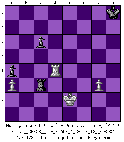 Last move : 1/2-1/2 2017 September 27 1:39:1 [Event "FICGS__CHESS__CUP_STAGE_1_GROUP_10__000001"] [Site "FICGS"] [Date "2017.03.01"] [Round "1"] [White "Murray,Russell"] [Black "Denisov,Timofey"] [Result "1/2-1/2"] [WhiteElo "2002"] [BlackElo "2248"] 1.d4 d5 2.Nf3 c6 3.e3 Nf6 4.c4 e6 5.Nbd2 Nbd7 6.Bd3 c5 7.O-O Be7 8.cxd5 exd5 9.b3 O-O 10.Bb2 cxd4 11.exd4 Re8 12.Rc1 Nf8 13.Ne5 Bd6 14.Re1 Ng6 15.a3 Nf4 16.Bb5 Re7 17.Bf1 Be6 18.Nb1 Ne4 19.f3 Nf6 20.Nc3 Bf5 21.Qd2 Ng6 22.Nd1 Rc7 23.Ne3 Rxc1 24.Rxc1 Be6 25.g3 Rc8 26.Rd1 a5 27.Nd3 Qb6 28.Nc5 Bxc5 29.dxc5 Qxb3 30.Bd4 Ne7 31.Qc1 Ne8 32.Qa1 Qa4 33.Rb1 Qd7 34.Kf2 Nc6 35.Bb5 Qe7 36.Bxc6 bxc6 37.Qc3 Ra8 38.Rb6 Bd7 39.h4 a4 40.Rb7 Qd8 41.Be5 h6 42.Nc2 f6 43.Bf4 g5 44.hxg5 hxg5 45.Bd6 Qc8 46.Qb2 g4 47.fxg4 Bxg4 48.Ne3 Bf5 49.Re7 Be4 50.Qe2 Qh3 51.Qg4+ Qxg4 52.Nxg4 Bg6 53.Rb7 d4 54.Be7 Ra5 55.Bxf6 Nxf6 56.Nxf6+ Kh8 57.Nd7 Bf5 58.Ke2 Bxd7 59.Rxd7 Rxc5 60.Rxd4 Rc3 1/2-1/2 Queen's pawn game Kingside Castling by player White (move 7) Kingside Castling by player Black (move 9) 10 pieces endgame at move 59 : White KRPPP , Black KRPPP WHITE : King + 1 Rook 3 Pawns BLACK : King + 1 Rook 3 Pawns 9 pieces endgame at move 59 : White KRPP , Black KRPPP WHITE : King + 1 Rook 2 Pawns BLACK : King + 1 Rook 3 Pawns 8 pieces endgame at move 60 : White KRPP , Black KRPP WHITE : King + 1 Rook 2 Pawns BLACK : King + 1 Rook 2 Pawns This chess game ended in a draw. Follow this game move after move (download)Bobby is the finest Chess player this country ever produced. His memory for the moves, his brilliance in dreaming up combinations, and his fierce determination to win are uncanny. (John Collins) Der Traum, für den ich lebe, ist der von einem freien Russland. Viele mögen sagen: Russland hat doch ein Parlament, einen gewählten Präsidenten. Aber ich spüre, dass in meiner Heimat die Angst wiederkehrt. Eine Angst, sich frei zu äußern, bestimmte Dinge zu tun (Garry Kasparov) El jugador táctico sabe que hacer cuando hay algo que hacer; mientras que el estratega sabe que hacer cuando no hay nada que hacer. (Gerald Abrahams) Plusieurs personnes se sont demandées comment Tal faisait pour gagner... En fait, c'est très simple ! Il met ses pièces au centre de l'échiquier et les sacrifie quelque part ! (David Bronstein) If we knew what we were doing, we would not call it research. (Albert Einstein)