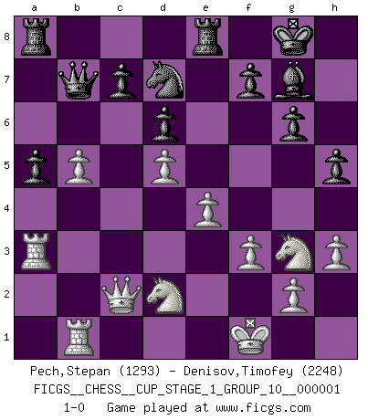 Last move : 1-0 2017 July 13 11:41:46 [Event "FICGS__CHESS__CUP_STAGE_1_GROUP_10__000001"] [Site "FICGS"] [Date "2017.03.01"] [Round "1"] [White "Pech,Stepan"] [Black "Denisov,Timofey"] [Result "1-0"] [WhiteElo "1293"] [BlackElo "2248"] 1.e4 e5 2.Nf3 Nc6 3.Bb5 a6 4.Ba4 Nf6 5.O-O Be7 6.Re1 b5 7.Bb3 O-O 8.c3 d6 9.h3 Bb7 10.d4 h6 11.Nbd2 Re8 12.Nf1 Bf8 13.Ng3 Na5 14.Bc2 Nc4 15.b3 Nb6 16.a4 bxa4 17.bxa4 a5 18.Bd3 Qc8 19.Ba3 Ba6 20.Bb5 Bxb5 21.axb5 exd4 22.cxd4 Nc4 23.Qc2 Nxa3 24.Rxa3 Qb7 25.d5 g6 26.Rb1 Bg7 27.Nd2 h5 28.Kf1 Nd7 29.f3 1-0 Ruy Lopez : Closed, 7...O-O Kingside Castling by player White (move 5) Kingside Castling by player Black (move 7) Player White won this chess game. Follow this game move after move (download)A Chess game is divided into three stages: the first, when you hope you have the advantage, the second when you believe you have an advantage, and the third... when you know you're going to lose ! (Savielly Tartakower) Verschiedene, sehr schätzbare und im Laufe des Lebens nützliche Eigenschaften des Geistes können durch das Schachspiel erworben und gekräftigt werden, so dass sie zu Gewohnheiten werden, die uns nie im Stich lassen. (Benjamin Franklin) En posiciones complicadas, Bobby Fischer pocas veces tuvo que temer de cualquiera. (Paul Keres) La guerre est enfant de la passion, la passion est enfant du narcissisme et le narcissisme est l'enfant. (...) Une autre partie ? (Thibault de Vassal) Gambling is the son of avarice and the father of despair. (French proverb)