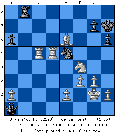 Last move : 1-0 2017 May 23 5:54:1 [Event "FICGS__CHESS__CUP_STAGE_1_GROUP_10__000001"] [Site "FICGS"] [Date "2017.03.01"] [Round "1"] [White "Bakhmatov,Andrey"] [Black "de la Foret,Fred"] [Result "1-0"] [WhiteElo "2173"] [BlackElo "1796"] 1.d4 f5 2.g3 Nf6 3.Bg2 e6 4.c4 Be7 5.Nh3 O-O 6.O-O Nc6 7.b3 d5 8.Bb2 Rb8 9.Na3 a6 10.Qc1 Qd7 11.Nc2 dxc4 12.bxc4 Na5 13.Ne3 b5 14.d5 exd5 15.Bxf6 Rxf6 16.Nxd5 Rd6 17.Nxe7+ Qxe7 18.cxb5 Rxb5 19.Qc3 Rd7 20.Rad1 Qc5 21.Qf3 Bb7 22.Rxd7 Bxf3 23.Bxf3 h6 24.Nf4 Qc2 25.Bd5+ Kh7 26.Bf7 Rb8 27.Rfd1 Nc6 28.Bg6+ Kh8 29.R1d5 Qe4 30.f3 Qb1+ 31.Kg2 Qb2 32.Rxc7 Ne5 33.Bxf5 Kg8 34.Rc2 Qa1 35.Be6+ Kh7 36.R2c5 1-0 This chess game has been lost on time (started : 2017.03.01 0:58:49) Dutch defense Kingside Castling by player Black (move 5) Kingside Castling by player White (move 6) Player White won this chess game. Follow this game move after move (download)Different people feel differently about resigning. (Bobby Fischer) Wie, soll nun auch die Opposition abgeschafft werden? Ja, es tut mir leid, Ihnen diesen Schmerz nicht ersparen zu können. (Aaron Nimzowitsch) El hombre es un frívolo, una creatura engañosa y como un jugador de Ajedrez, se preocupa mas por el proceso de obtener su meta que de la meta por sí misma. (Dostoyevsky) L'ordinateur a tué l'originalité. Il n'y a plus guère d'aventures sur l'échiquier. (Jacob Murray) O divine art of subtlety and secrecy! Through you we learn to be invisible, through you inaudible and hence we can hold the enemy's fate in our hands. (Sun Tzu)