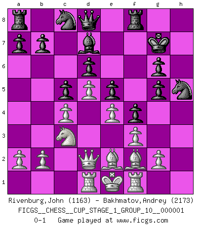 Last move : 0-1 2017 May 23 5:54:1 [Event "FICGS__CHESS__CUP_STAGE_1_GROUP_10__000001"] [Site "FICGS"] [Date "2017.03.01"] [Round "1"] [White "Rivenburg,John"] [Black "Bakhmatov,Andrey"] [Result "0-1"] [WhiteElo "1163"] [BlackElo "2173"] 1.d4 Nf6 2.Nf3 g6 3.c4 Bg7 4.Nc3 O-O 5.e4 d6 6.Be2 e5 7.Be3 Nc6 8.d5 Ne7 9.O-O Ng4 10.Bd2 f5 11.Ng5 Nf6 12.f3 c6 13.Be3 Bh6 14.h4 f4 15.Bf2 c5 16.Qd2 Bd7 17.Rad1 Bxg5 18.hxg5 Nh5 19.Bh4 Nc8 20.Kf2 h6 21.Ke1 hxg5 22.Bf2 Kg7 0-1 This chess game has been lost on time (started : 2017.03.01 0:58:49) King's Indian : East Indian defense Kingside Castling by player Black (move 4) Kingside Castling by player White (move 9) Player Black won this chess game. Follow this game move after move (download)Spassky will not be psyched out by Fischer. (Mike Goodall) Die Leute spielen gegen mich seit 15 Jahren unter Ihren Möglichkeiten. (Robert James Fischer) Fischer es el jugador mas fuerte del mundo. De hecho, el jugador mas fuerte que jamas haya existido. (Larry Evans) J'ai toujours senti une vague pitié pour l'homme qui ne connaît rien aux échecs, tout comme j'en aurais pour un homme ignorant de l'amour. Les Echecs, comme la musique ou comme l'amour, ont le pouvoir de rendre heureux. (Siegbert Tarrasch) As a goal marker shodan is important. As a destination it is a poor place to stop. (Thomas Tamayo)