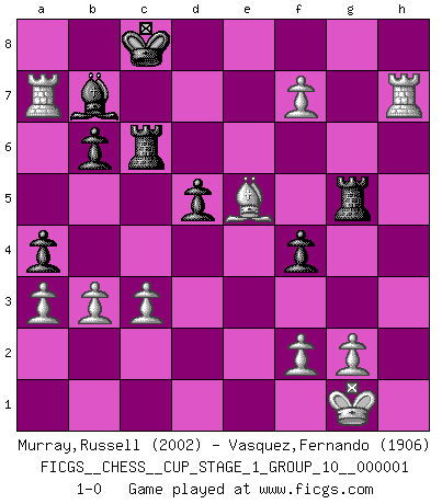 Last move : 1-0 2017 July 8 19:0:53 [Event "FICGS__CHESS__CUP_STAGE_1_GROUP_10__000001"] [Site "FICGS"] [Date "2017.03.01"] [Round "1"] [White "Murray,Russell"] [Black "Vasquez,Fernando"] [Result "1-0"] [WhiteElo "2002"] [BlackElo "1906"] 1.d4 Nf6 2.Nf3 d5 3.e3 e6 4.Bd3 c5 5.b3 Nc6 6.O-O Be7 7.Bb2 O-O 8.Nbd2 cxd4 9.exd4 Nb4 10.Be2 b6 11.a3 Nc6 12.Bd3 a5 13.Re1 Bb7 14.Ne5 Nxe5 15.dxe5 Nd7 16.Re3 Nc5 17.Bxh7+ Kxh7 18.Qh5+ Kg8 19.Rg3 Re8 20.Rh3 f5 21.Qg6 Bf8 22.Bd4 Ne4 23.Nf3 Qc7 24.Rh7 Re7 25.c3 Qc6 26.Rh6 Rc7 27.Re1 Qe8 28.Qh7+ Kf7 29.Rxe4 Ke7 30.Ng5 Rc6 31.Reh4 Kd8 32.Rg6 Qe7 33.Qg8 Kd7 34.Rh7 Re8 35.h4 Ba6 36.h5 f4 37.Rf6 Kc8 38.h6 a4 39.Rf7 Qd8 40.hxg7 Bxg7 41.Qxg7 Rg8 42.Qf6 Qxf6 43.exf6 e5 44.Ra7 Bb7 45.Bxe5 Rxg5 46.f7 1-0 Queen's pawn game Kingside Castling by player White (move 6) Kingside Castling by player Black (move 7) Player White won this chess game. Follow this game move after move (download)Half the variations which are calculated in a tournament game turn out to be completely superfluous. Unfortunately, no one knows in advance which half. (Jan Tinman) Eine Person mit durchschnittlichem IQ kann etwa eine ELO von 2000 erreichen. (Jonathan Levitt) Un sacrificio se refuta mucho mejor al aceptarlo. (Wilhelm Steinitz) Toute estimation doit être constamment réévaluée. (Jacob Estrin) There is far too much law for those who can afford it and far too little for those who cannot. (Derek Bok)