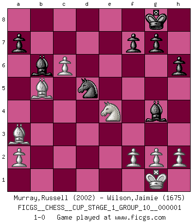 Last move : 1-0 2017 July 1 18:21:55 [Event "FICGS__CHESS__CUP_STAGE_1_GROUP_10__000001"] [Site "FICGS"] [Date "2017.03.01"] [Round "1"] [White "Murray,Russell"] [Black "Wilson,Jaimie"] [Result "1-0"] [WhiteElo "2002"] [BlackElo "1675"] 1.d4 d5 2.Nf3 c5 3.e3 Nf6 4.c3 e6 5.Bd3 Nc6 6.Nbd2 Bd6 7.O-O O-O 8.dxc5 Bxc5 9.b4 Bd6 10.Bb2 e5 11.e4 h6 12.exd5 Nxd5 13.b5 Na5 14.Re1 Bg4 15.Bf1 Re8 16.Ne4 Bf8 17.c4 Nb6 18.c5 Qxd1 19.Raxd1 Nbc4 20.Bc3 Rac8 21.Bb4 Red8 22.Rxd8 Rxd8 23.Nxe5 Nxe5 24.Bxa5 Rd4 25.Bc3 Rd5 26.Re3 Ng6 27.c6 bxc6 28.bxc6 Bc5 29.Rd3 Rxd3 30.Bxd3 Bb6 31.Bb5 Ne7 32.Bb4 Nd5 33.Ba3 1-0 Queen's pawn game, Krause variation Kingside Castling by player White (move 7) Kingside Castling by player Black (move 7) Player White won this chess game. Follow this game move after move (download)Up to this point White has been following well-known analysis. But now he makes a fatal error: he begins to use his own head. (Siegbert Tarrasch) Wenn ein Kopf und ein Buch zusammenstoßen und es klingt hohl, ist es denn allemal im Buche? (Georg Christoph Lichtenberg) El Ajedrez es el arte del análisis. (Mikhail Botvinnik) Votre prénom est 'Tactique', votre deuxième prénom est 'Tactique' et votre nom est 'Tactique'. (Ken Smith) Information on the Internet is subject to the same rules and regulations as conversation at a bar. (George Lundberg)
