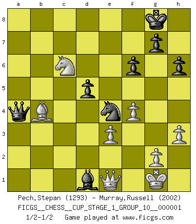 Last move : 1/2-1/2 2017 August 25 4:1:57 [Event "FICGS__CHESS__CUP_STAGE_1_GROUP_10__000001"] [Site "FICGS"] [Date "2017.03.01"] [Round "1"] [White "Pech,Stepan"] [Black "Murray,Russell"] [Result "1/2-1/2"] [WhiteElo "1293"] [BlackElo "2002"] 1.d4 d5 2.c4 dxc4 3.Nf3 Nf6 4.e3 e6 5.Bxc4 c5 6.O-O a6 7.b3 Nbd7 8.Bb2 b5 9.Be2 Bb7 10.Nbd2 Be7 11.a4 b4 12.Nc4 O-O 13.Rc1 Rc8 14.Qc2 Be4 15.Qd2 cxd4 16.Nxd4 Nd5 17.Rfd1 Nc5 18.f3 Bg6 19.Ne5 Bg5 20.f4 Bf6 21.Ng4 a5 22.Nxf6+ Qxf6 23.Bc4 Ne4 24.Qe1 Qe7 25.Bxd5 exd5 26.Nc6 Qe6 27.Nxa5 Bh5 28.Rxc8 Rxc8 29.Rc1 f6 30.Qxb4 Rxc1+ 31.Bxc1 Qc8 32.Ba3 h6 33.h3 Bd1 34.Qe1 Qc2 35.Nc6 Qxb3 36.Bb4 Qxa4 1/2-1/2 QGA : Classical, 6...a6 Kingside Castling by player White (move 6) Kingside Castling by player Black (move 12) This chess game ended in a draw. Follow this game move after move (download)Why must I lose to this idiot ? (Aron Nimzovich) Der Vorposten provoziert a) eine Basis für neue Angriffe und b) eine Schwächung der gegnerischen Widerstandskraft in der fraglichen Linie. (Aaron Nimzowitsch) Todos los jugadores de Ajedrez deberían tener un pasatiempo. (Savielly Tartakower) Des combinaisons [dans le jeu d'échecs] pareilles à des mélodies. Je crois entendre pour ainsi dire la musique des coups... (Vladimir Nabokov) There are more things in heaven and earth than practically anywhere else. (Unknown)
