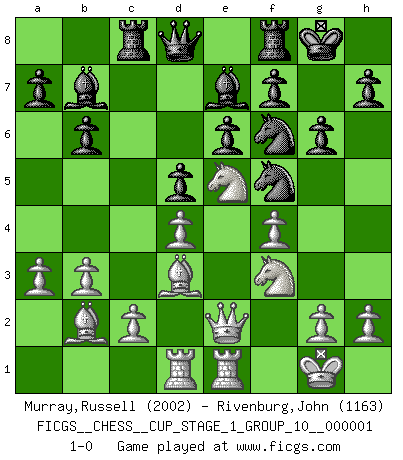 Last move : 1-0 2017 May 31 7:26:1 [Event "FICGS__CHESS__CUP_STAGE_1_GROUP_10__000001"] [Site "FICGS"] [Date "2017.03.01"] [Round "1"] [White "Murray,Russell"] [Black "Rivenburg,John"] [Result "1-0"] [WhiteElo "2002"] [BlackElo "1163"] 1.d4 Nf6 2.Nf3 e6 3.e3 d5 4.Bd3 c5 5.b3 cxd4 6.exd4 Bd6 7.O-O O-O 8.Re1 b6 9.Qe2 Nc6 10.a3 Bb7 11.Nbd2 Rc8 12.Bb2 g6 13.Rad1 Ne7 14.Ne5 Nf5 15.f4 Be7 16.Ndf3 1-0 This chess game has been lost on time (started : 2017.03.01 0:58:49) Queen's pawn : Yusupov-Rubinstein system Kingside Castling by player White (move 7) Kingside Castling by player Black (move 7) Player White won this chess game. Follow this game move after move (download)You have to have the fighting spirit. You have to force moves and take chances. (Bobby Fischer) Kombinieren und Schwarzhandel gehören verboten. (Savielly Grigorievitsch Tartakower) Si tu oponente te ofrece un empate, trata de averiguar porque piensa él que esta en una posición peor. (Nigel Short) Un millionnaire : 'Monsieur Steinitz ! Vous ne participez aux tournois que pour l'argent, alors que moi je n'y viens que pour l'honneur.' Steinitz : 'Chacun joue pour ce qu'il n'a pas'... Remember : Your focus determines your reality. (Qui-Gon Jinn in Star Wars ep.1)